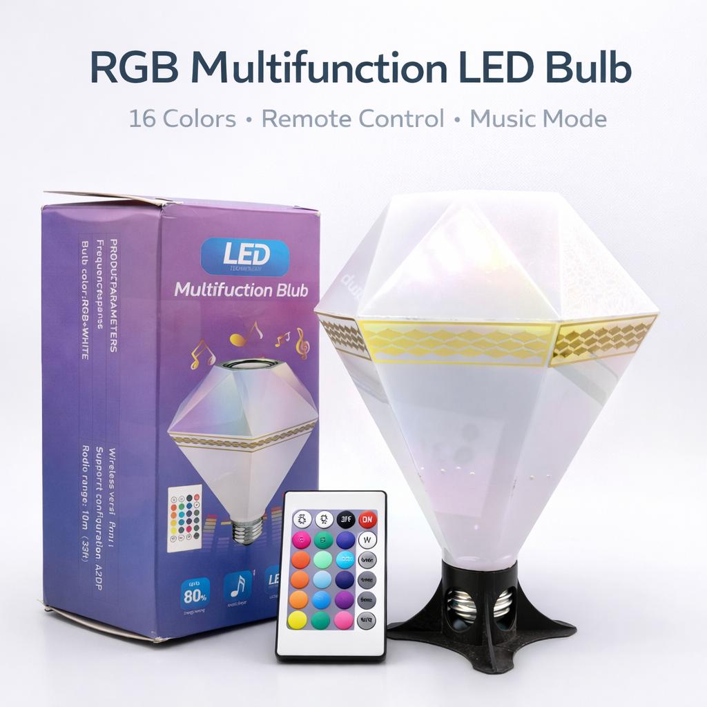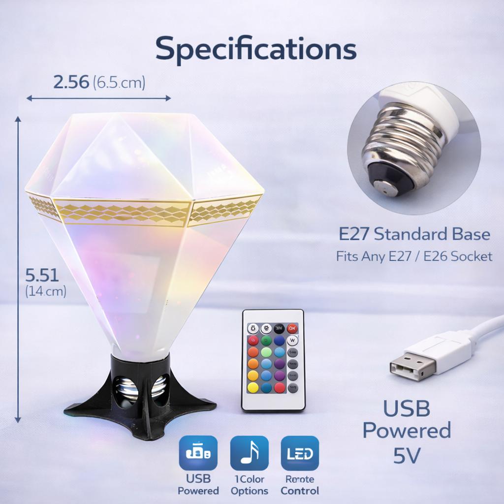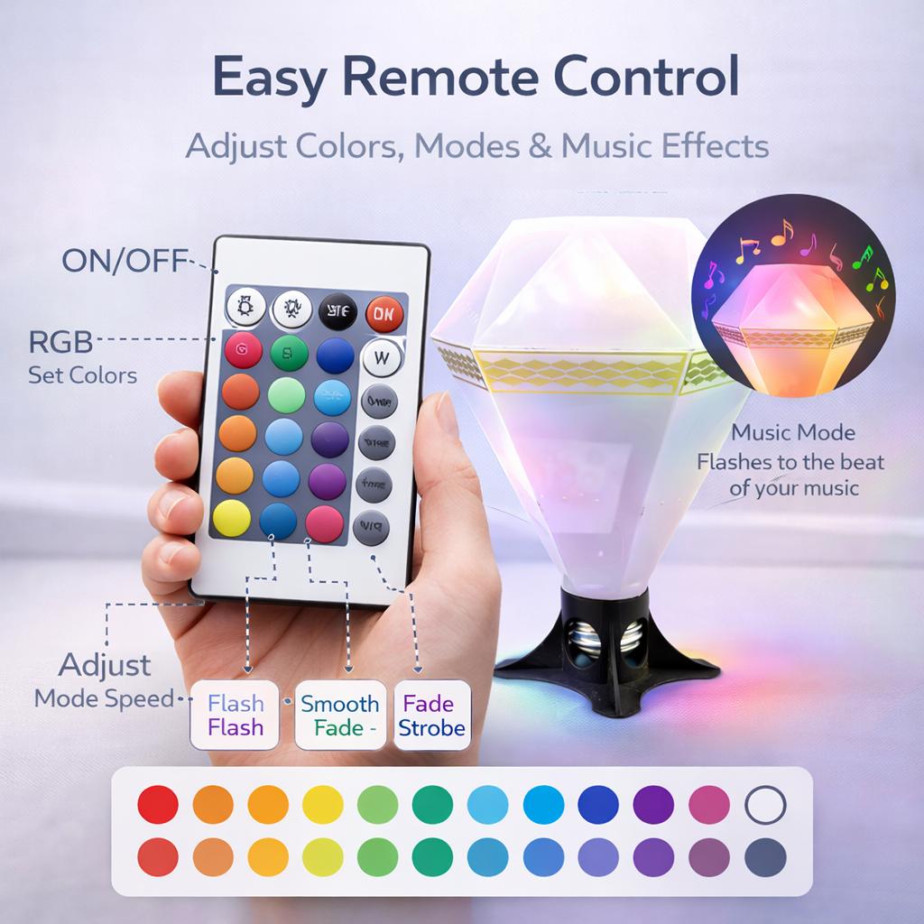 Elevate your room’s ambiance with this multifunctional Diamond-style RGB LED bulb. Combining vibrant lighting with a built-in speaker, it syncs your favorite music with dynamic light shows. Designed with a standard E27 base, it fits easily into most sockets, while the included remote gives you full control over colors, brightness, and specialized modes.
