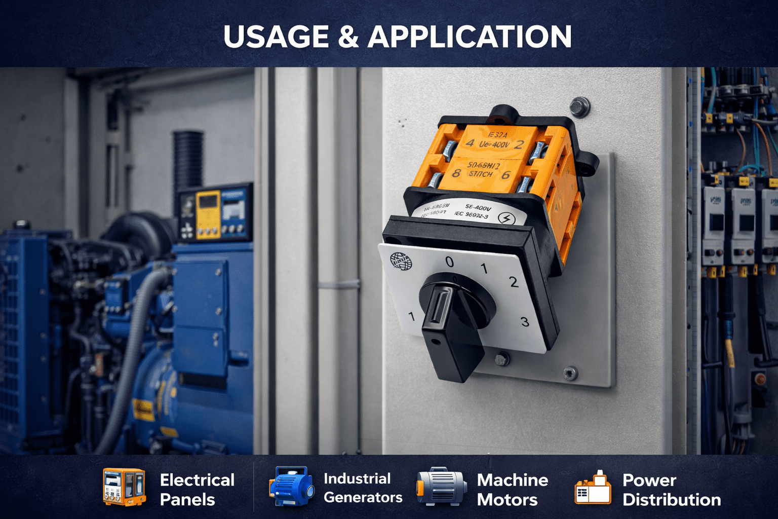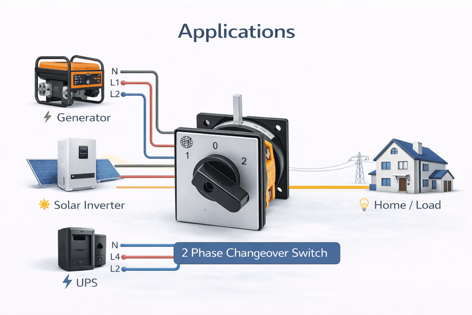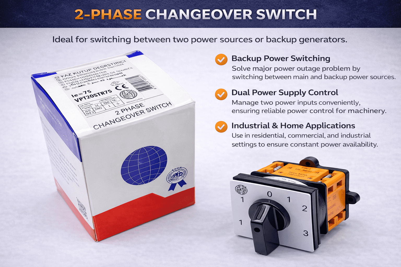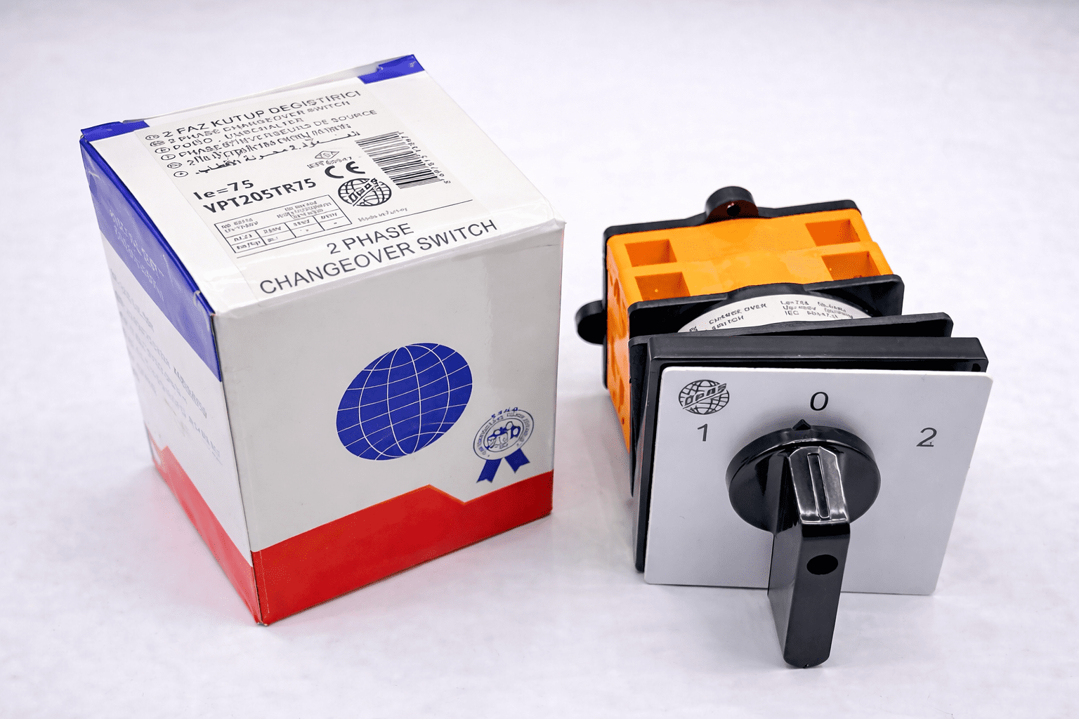 A OPAS 2 Phase Changeover Switch is an electromechanical device designed to manually switch between two power sources (e.g., mains and generator) in a 2-phase system. It’s commonly used in industrial control panels, automation systems, and other applications where safe and reliable source selection is required.
