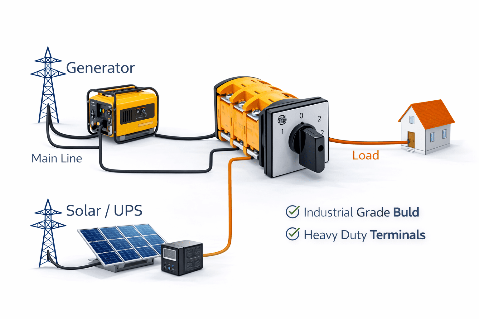 - Residential: Switch between main supply and generator/inverter.