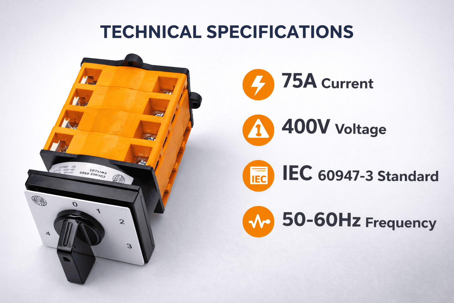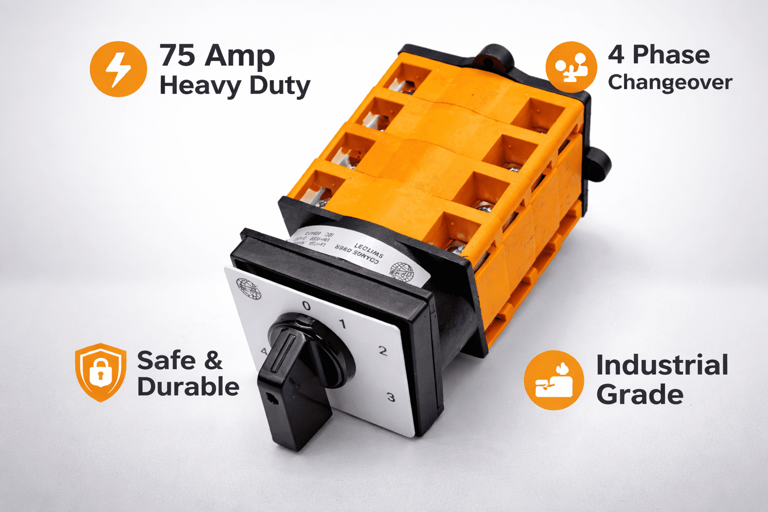 Upgrade your power control setup with the YPT205TR75 Cam Changeover Switch – a heavy-duty 4-phase rotary switch engineered for reliability and performance. Ideal for switching between power sources like generators and mains, this switch features a manual rotary selector (0-1-2-3-4 positions), offering total control and safety in industrial environments.