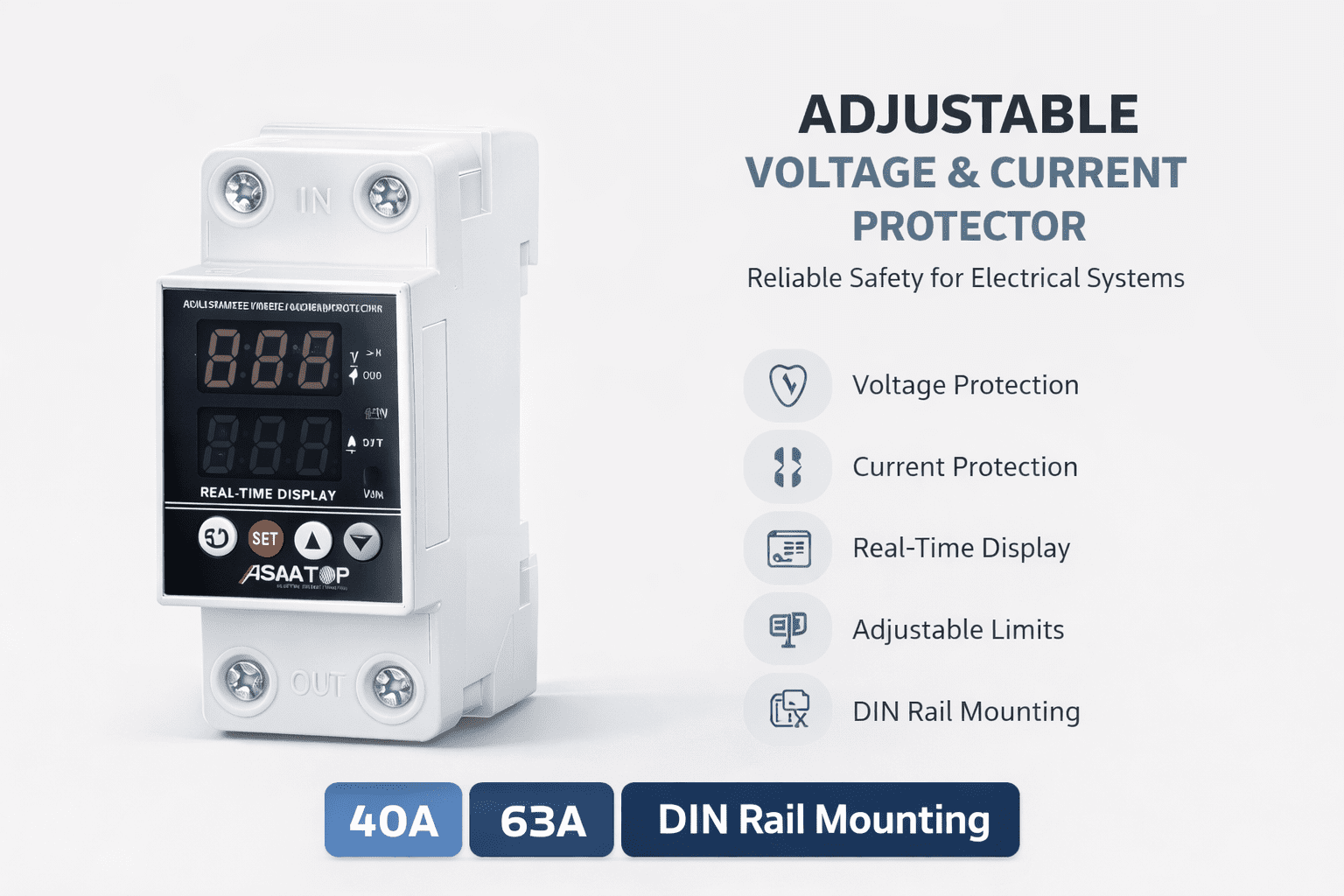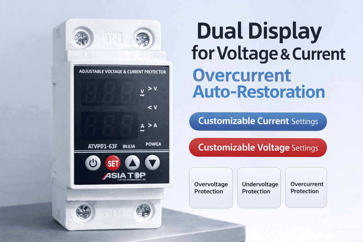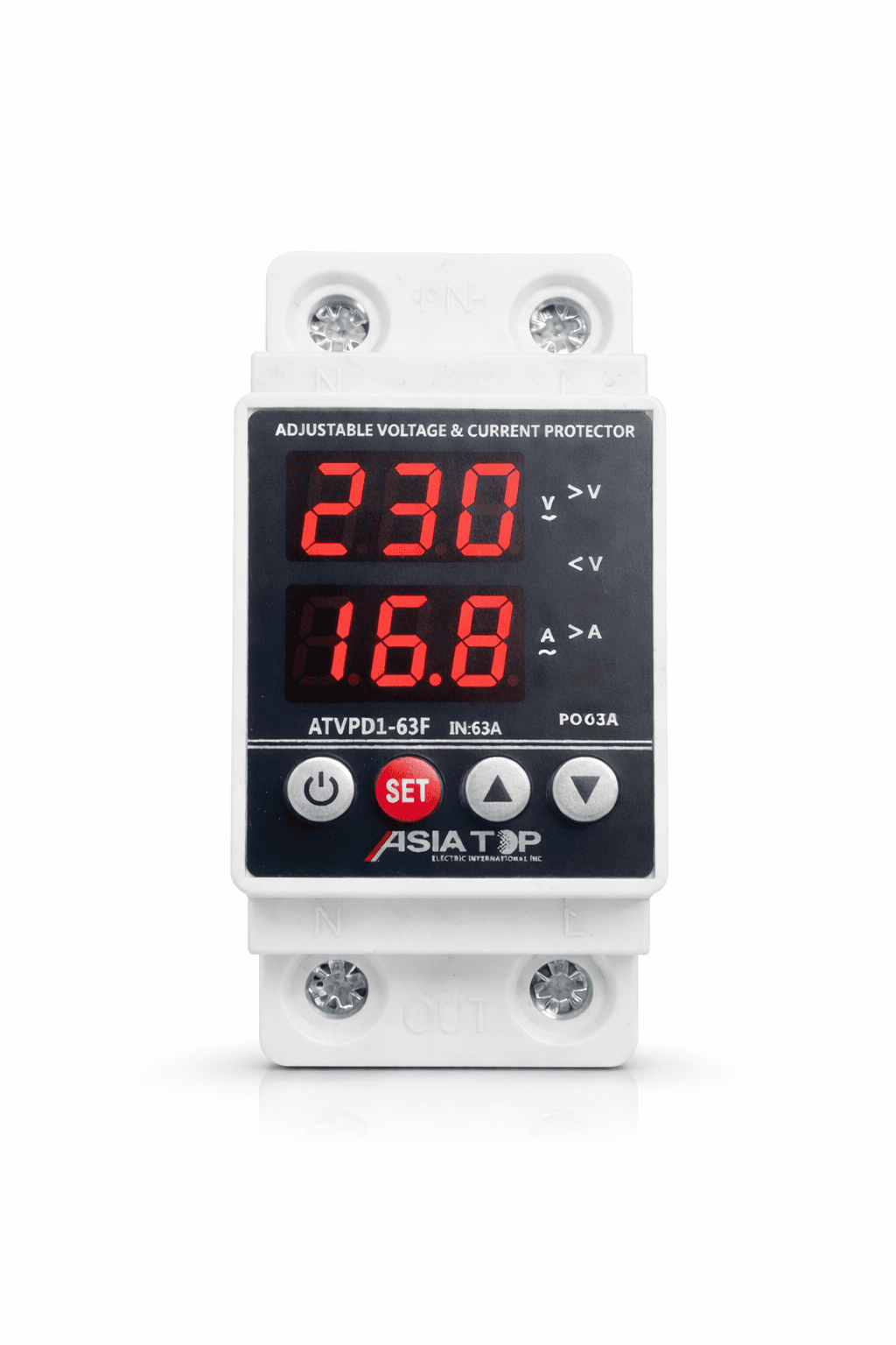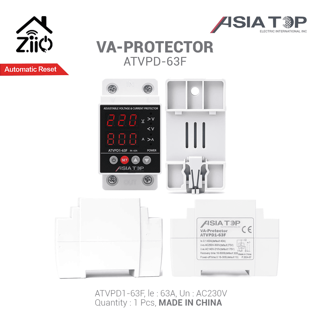 Protect your electrical appliances and systems with the ASIA-TOP Adjustable Voltage & Current Protector. This advanced device is designed to monitor, display, and regulate voltage and current levels in real-time, ensuring your equipment operates within safe parameters.