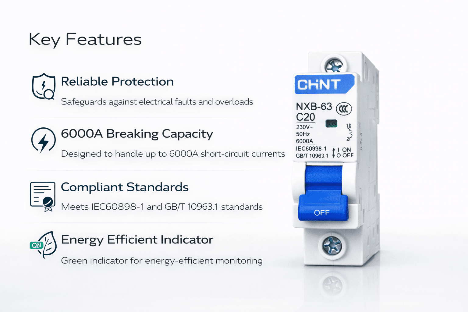 The CHINT NXB-63 MCB series is designed to provide dependable protection for electrical circuits in homes, offices, and industrial environments. With advanced technology, durable construction, and global trust in the CHINT brand, these breakers safeguard your system against overloads and short circuits while maintaining stable performance.