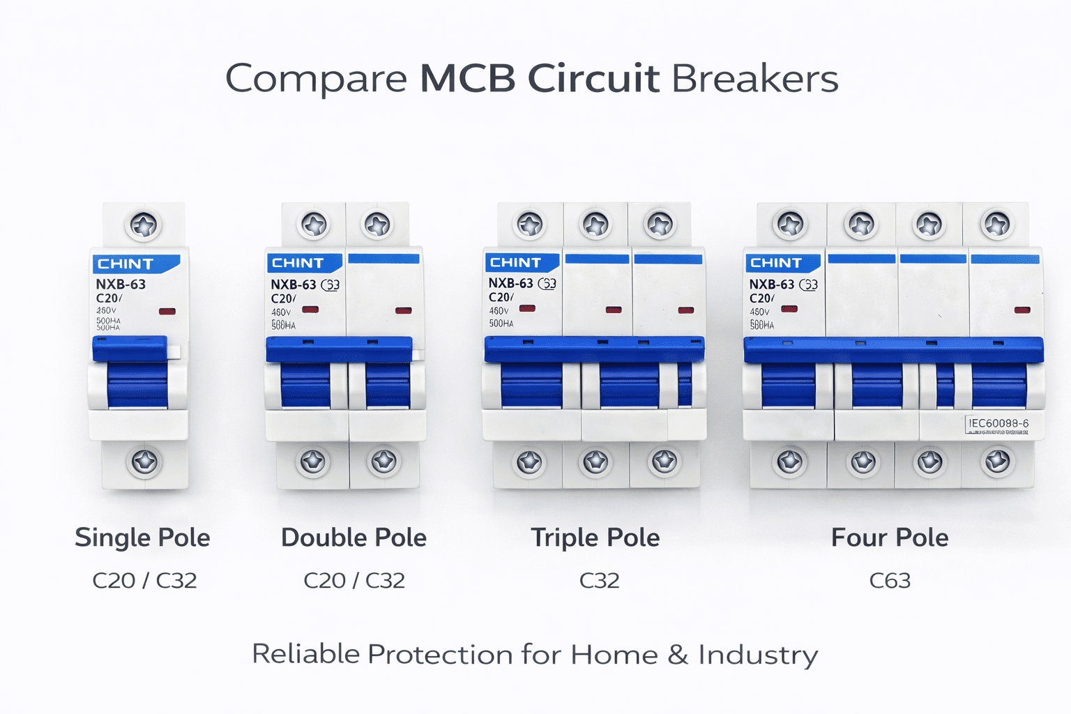 The Four Pole (4P) MCB extends the protection of the 3P breaker by also including the neutral line, making it the safest option for three-phase systems with neutral.
