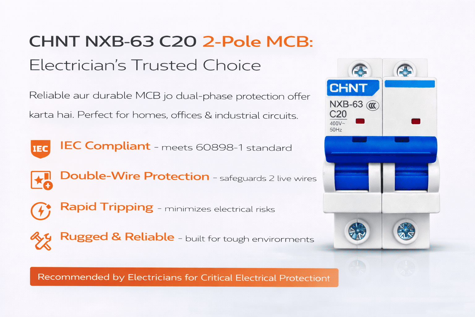 The Double Pole (2P) MCB provides protection for both the phase and neutral wires simultaneously. This ensures extra safety, especially in single-phase systems where both conductors need secure isolation.