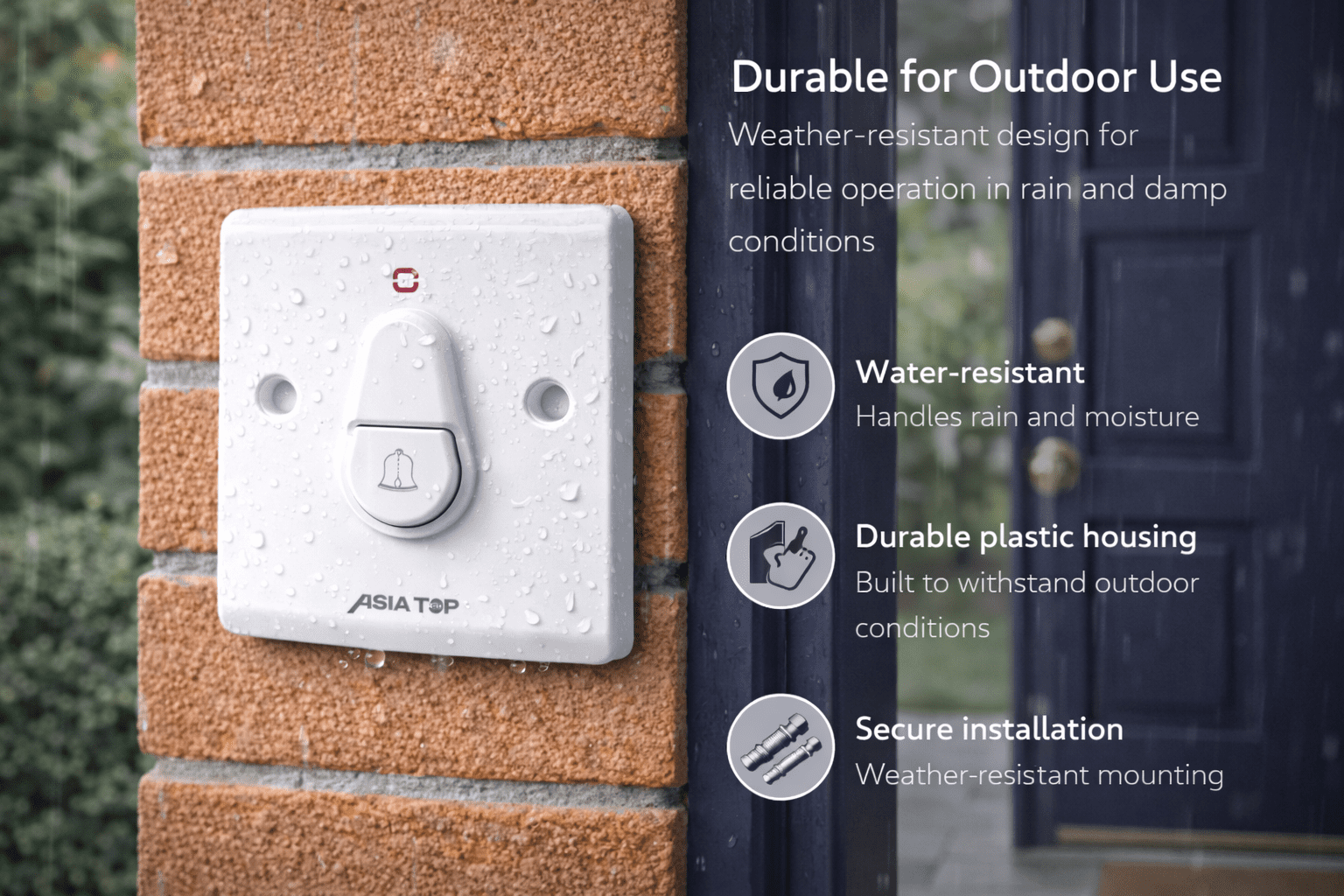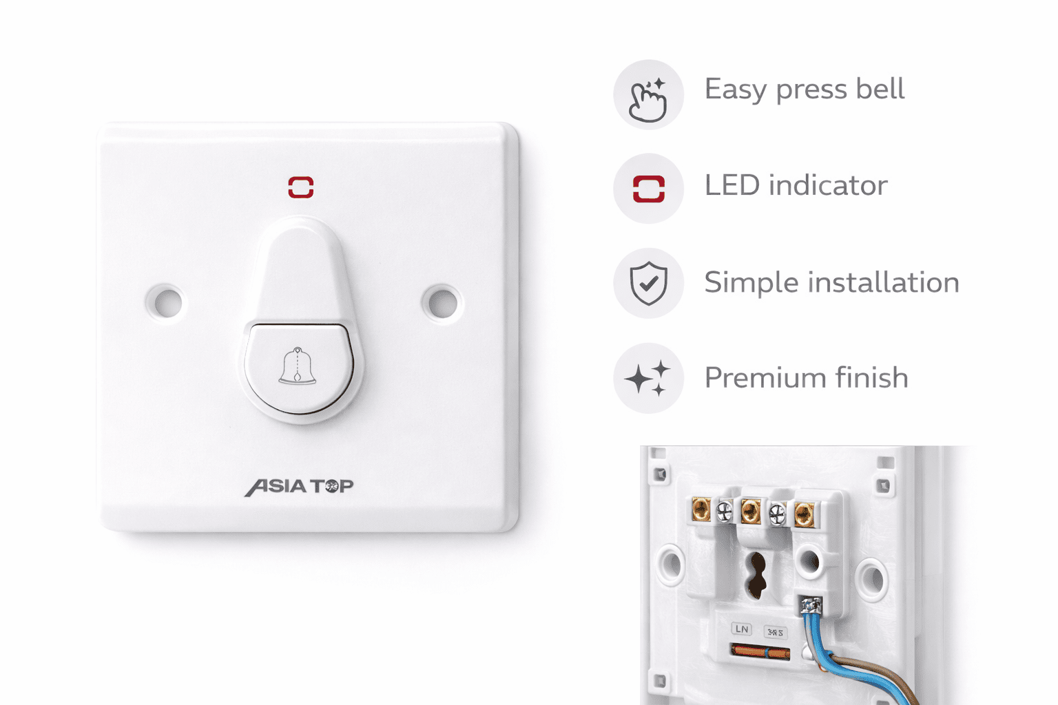 The Asia Top Door Bell Switch is a high-quality, durable wall-mounted bell switch designed for residential and commercial use. Engineered for reliability and ease of installation, this switch is an essential component for any doorbell system.