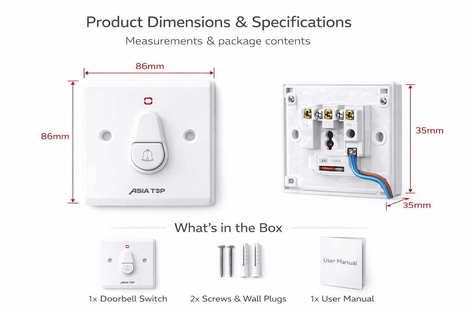 - Faceplate Size: Approx. 86mm x 86mm (standard wall switch size)