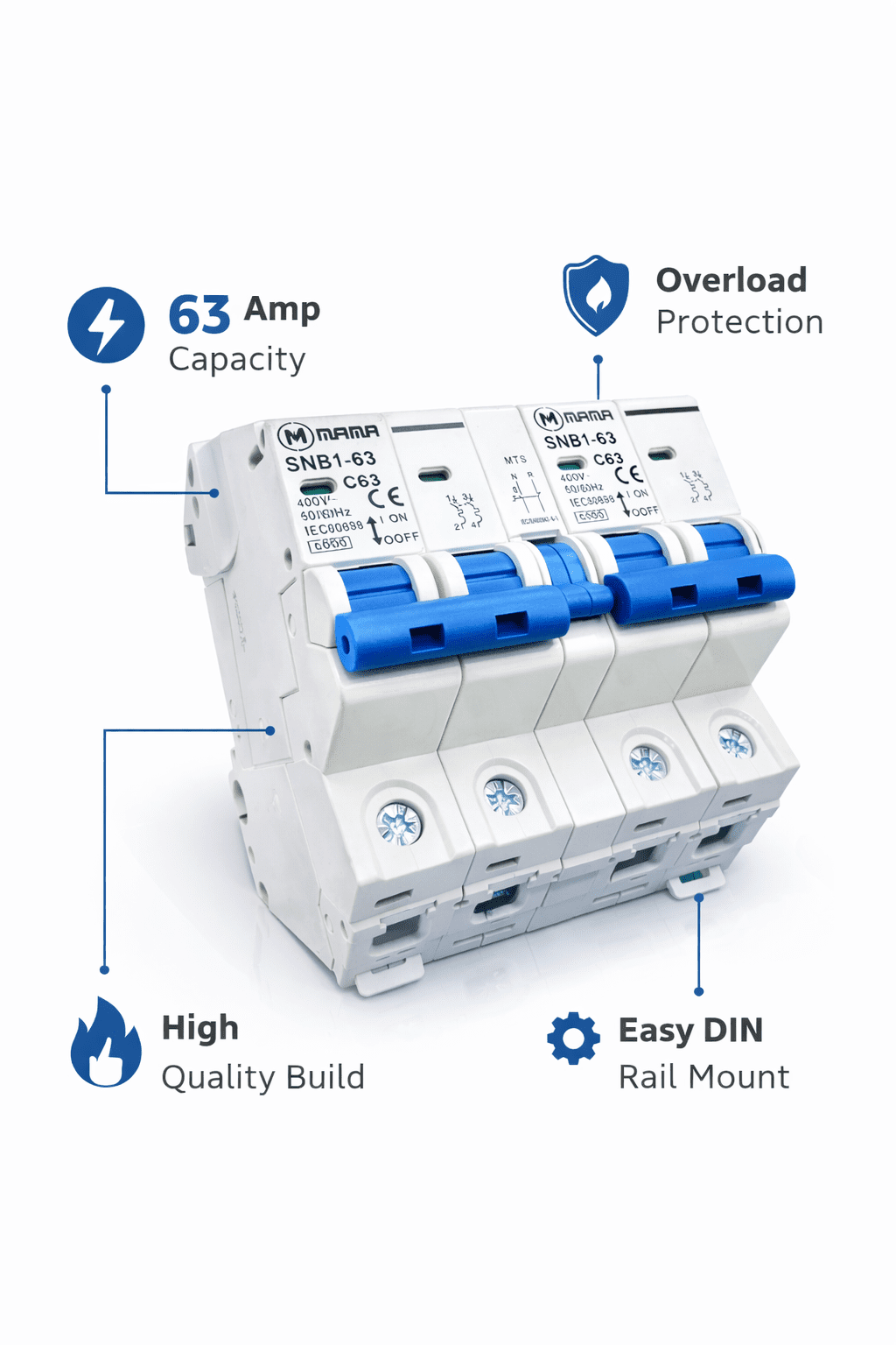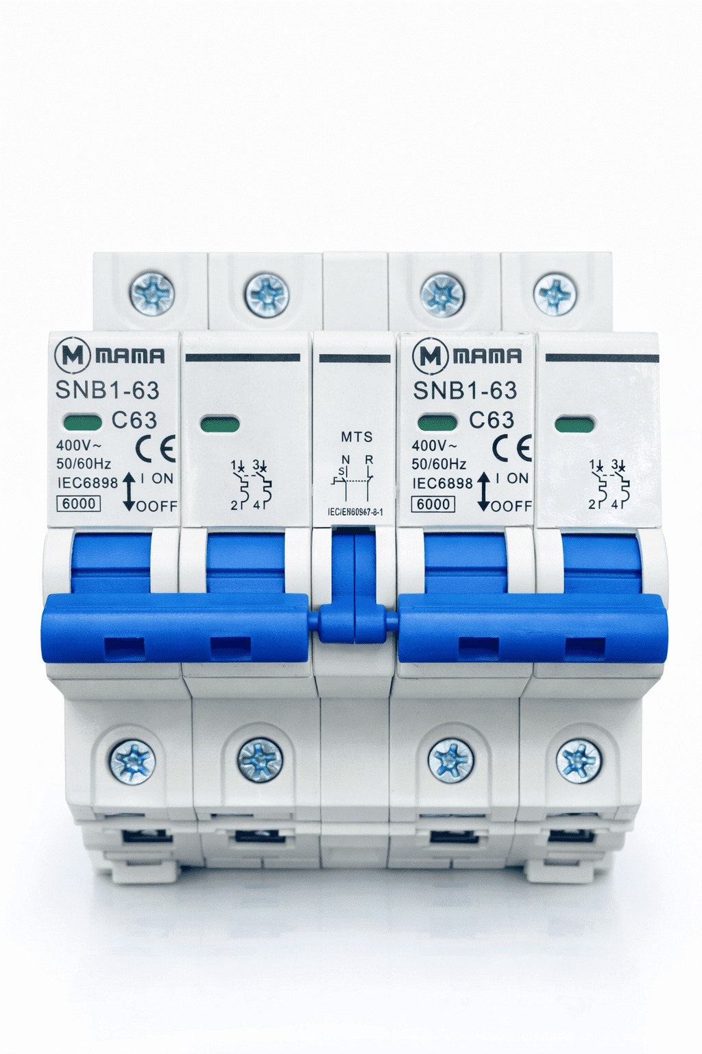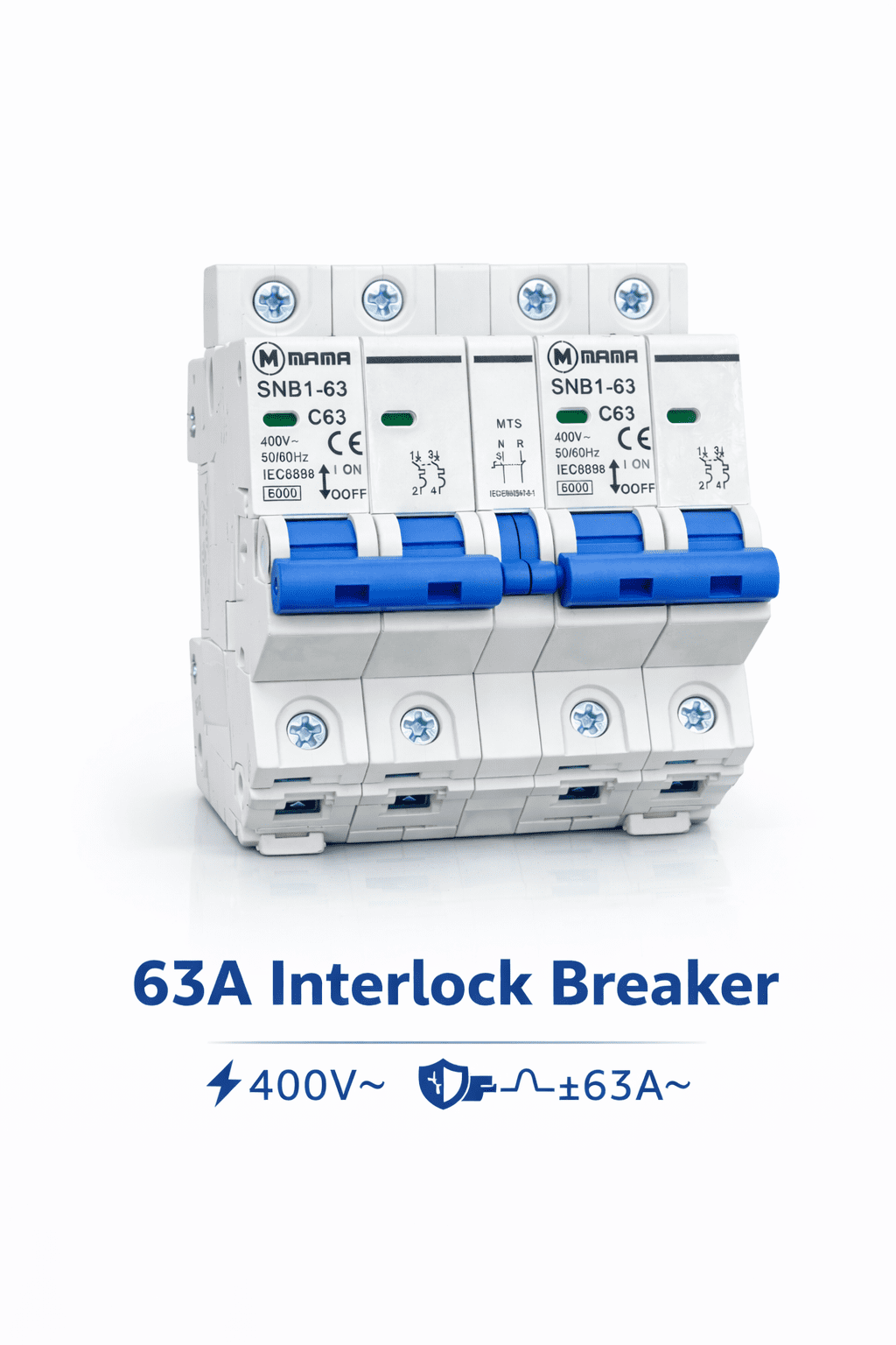 The MAMA SNB1-63 is a modular 3-pole miniature circuit breaker (MCB) designed for the protection of low-voltage electrical circuits against overload and short-circuit currents. It features an interlock system for improved safety and is compliant with international standards for residential, commercial, and industrial applications.
