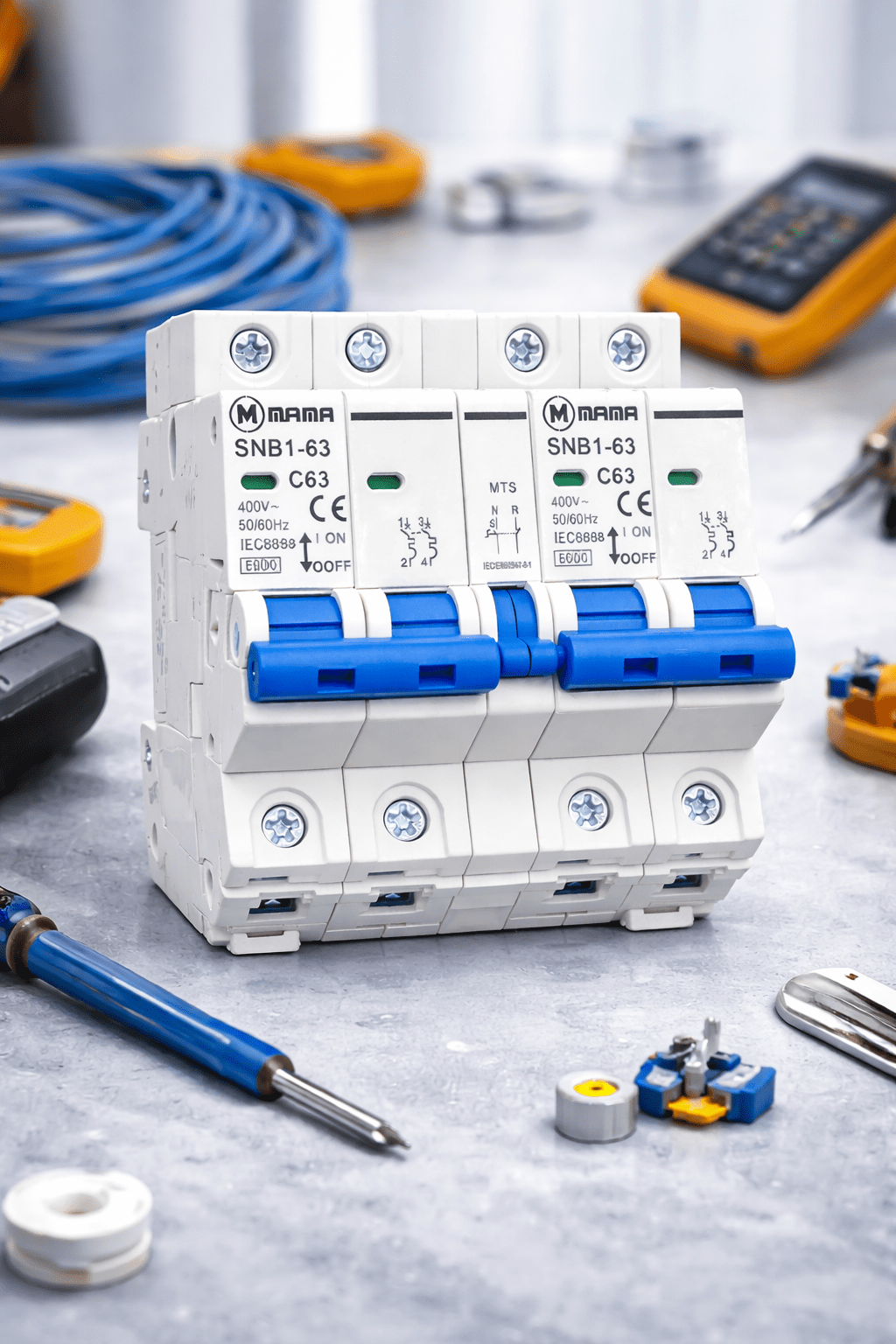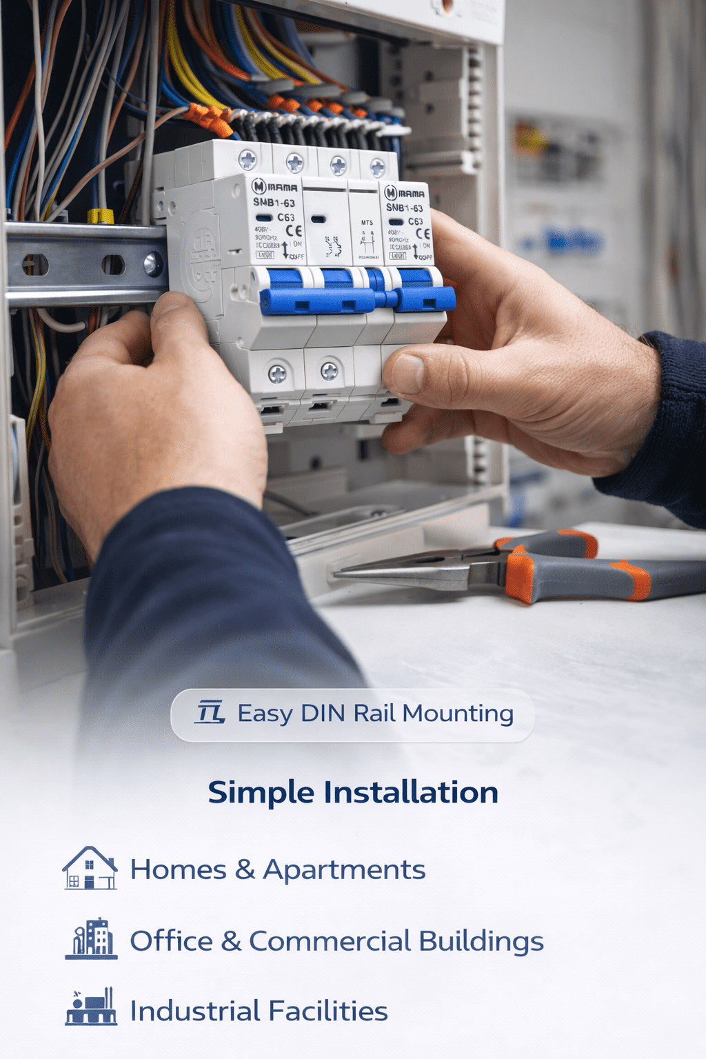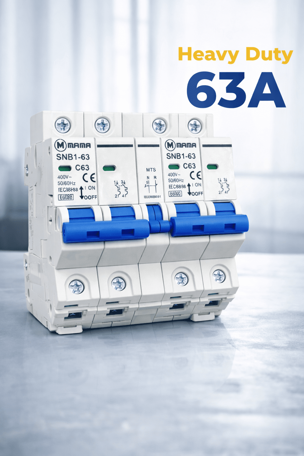 The MAMA SNB1-63 is a modular 3-pole miniature circuit breaker (MCB) designed for the protection of low-voltage electrical circuits against overload and short-circuit currents. It features an interlock system for improved safety and is compliant with international standards for residential, commercial, and industrial applications.