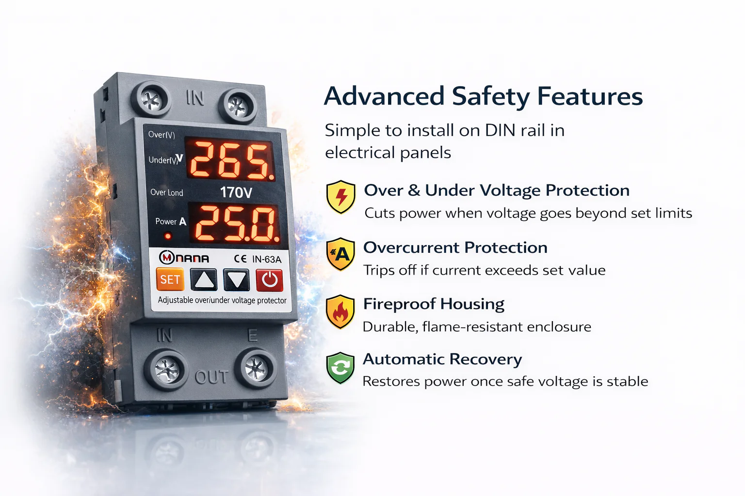 • Purpose: The device is designed to protect electrical appliances from voltage and current (ampere) fluctuations. It helps in preventing damage due to over-voltage, under-voltage, and over-current conditions.