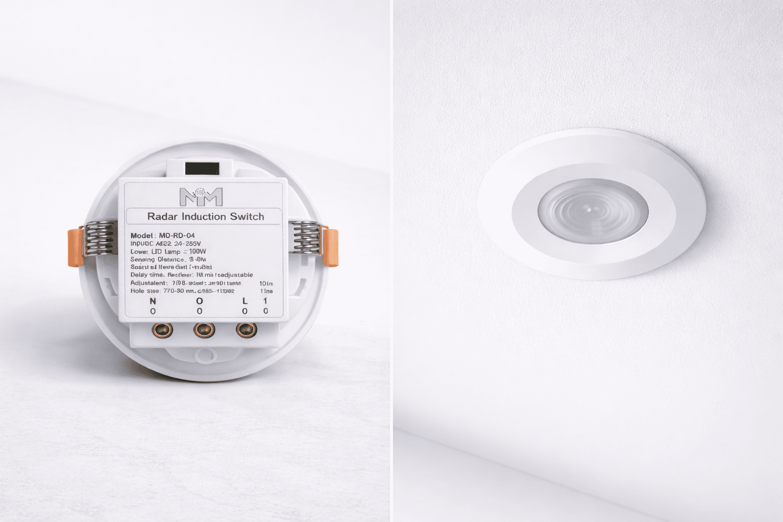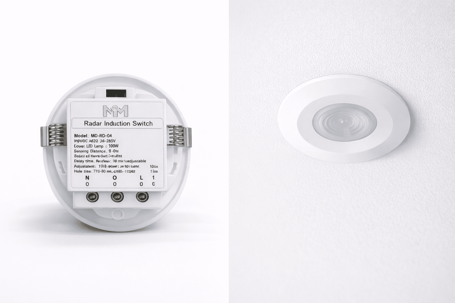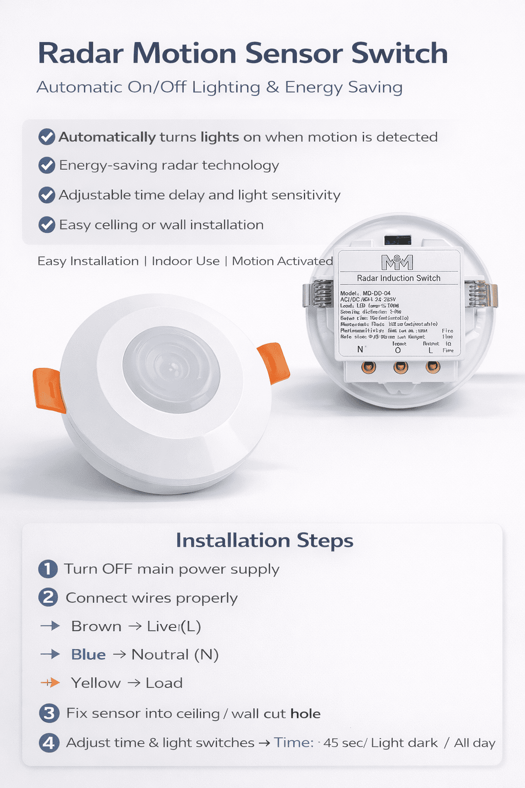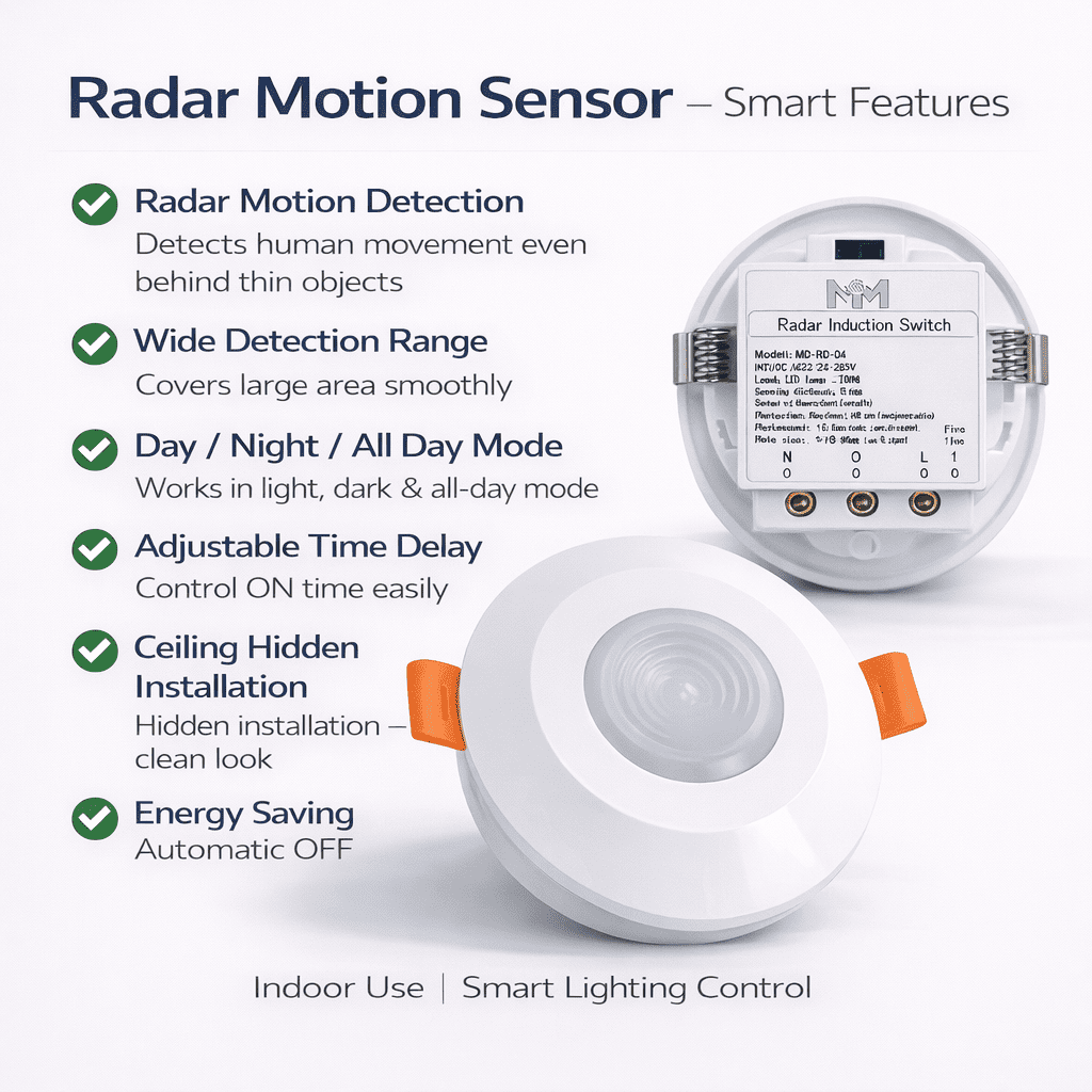 Enhance your lighting system with the M&M Radar Induction Switch, a state-of-the-art motion sensor designed for seamless automation. Utilizing advanced radar detection technology, this switch automatically turns lights on or off based on movement within its sensing range, providing energy efficiency, convenience, and security.