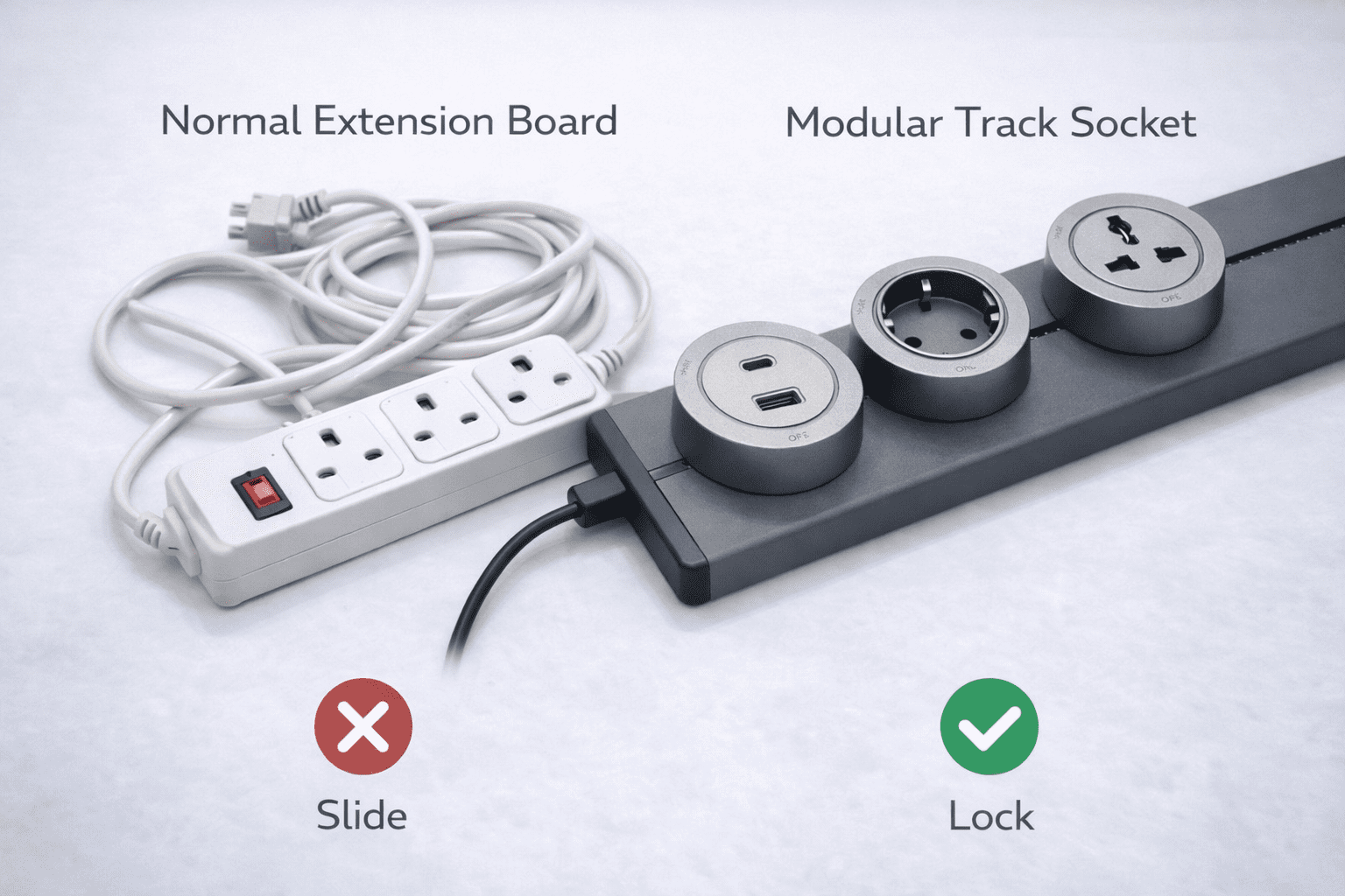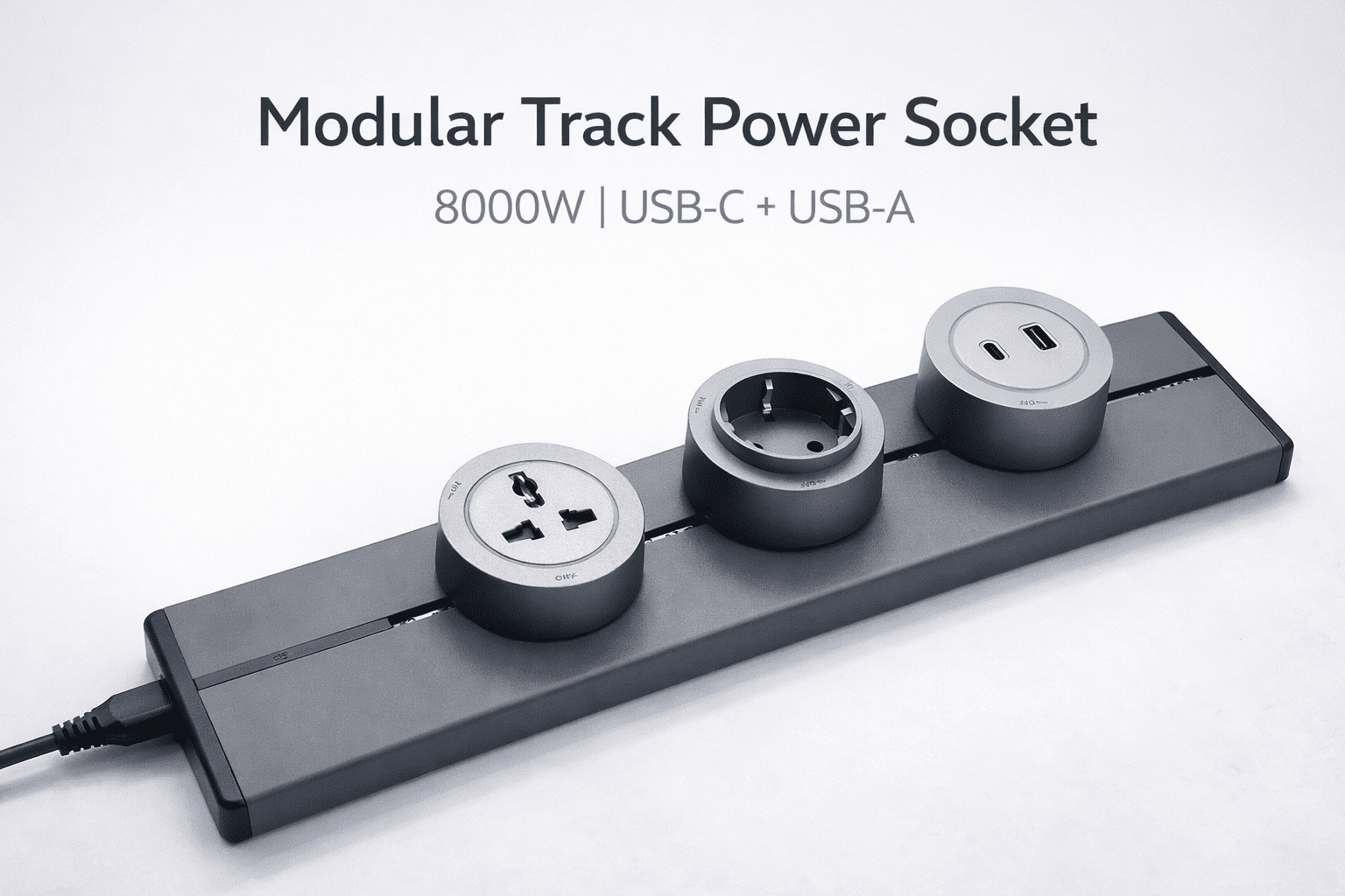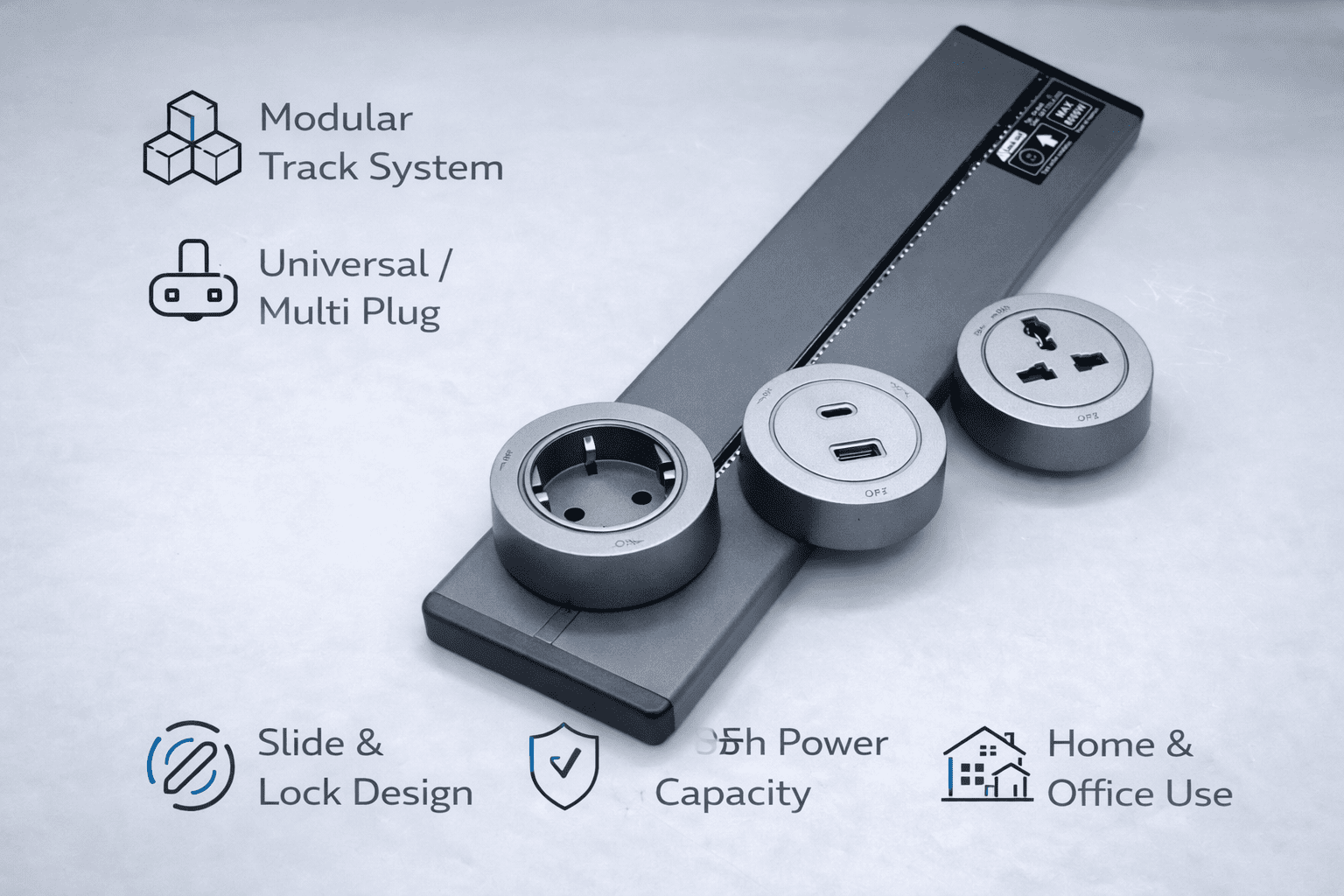 Model Type: Track-Based Modular Socket System Application: Office, Industrial, Commercial, and High-End Residential Power Management Power Capacity: Max. Load – 8000WOperating Voltage: 220V–250V, 50/60Hz Mounting Type: Surface or Under-Desk Installation