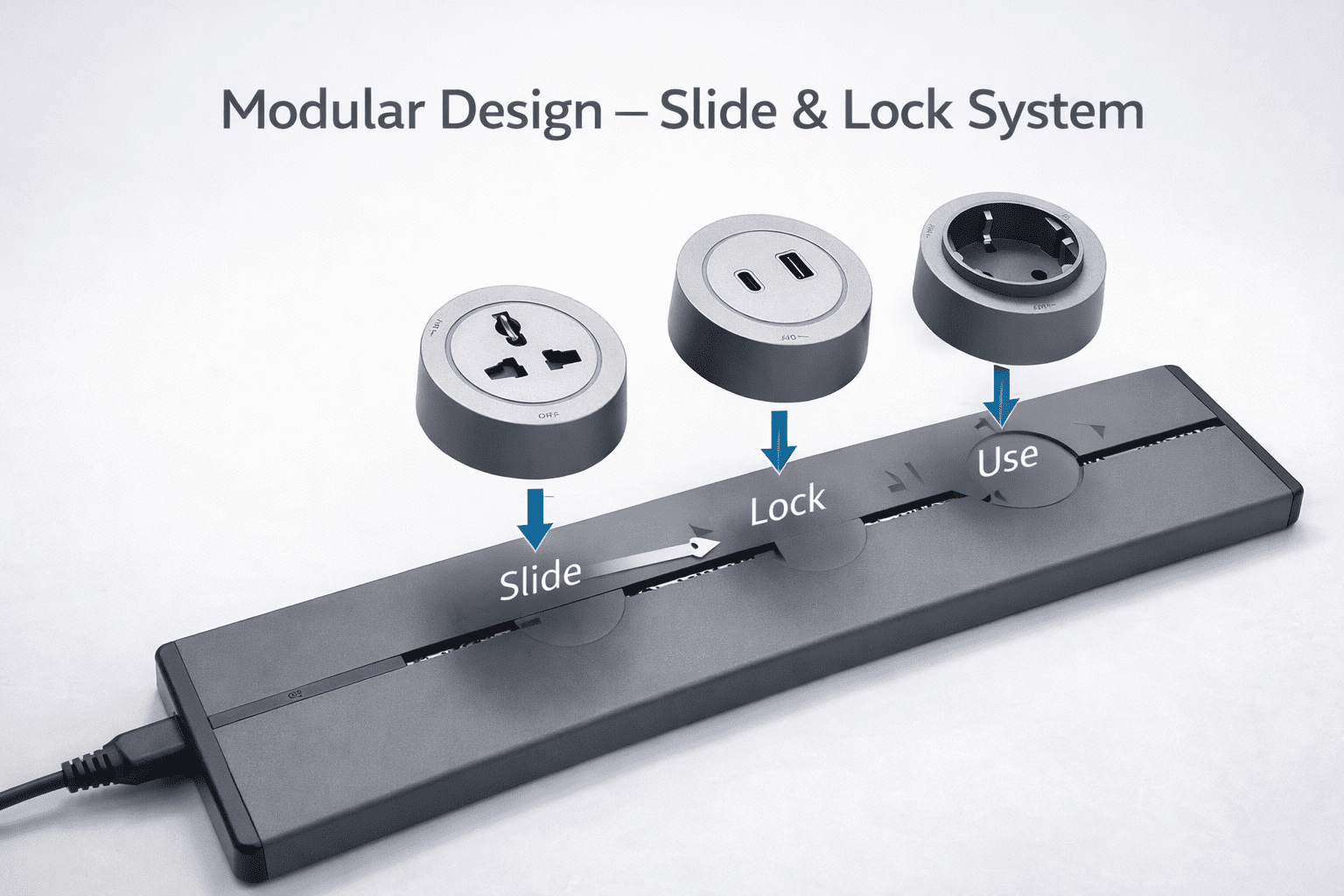 The system displayed is a high-capacity modular power track designed to deliver flexible and scalable power access in workstations, offices, laboratories, and commercial settings. The design facilitates the insertion and removal of interchangeable socket modules along a central conductive rail, allowing end-users to customize power outlet configurations as required.
