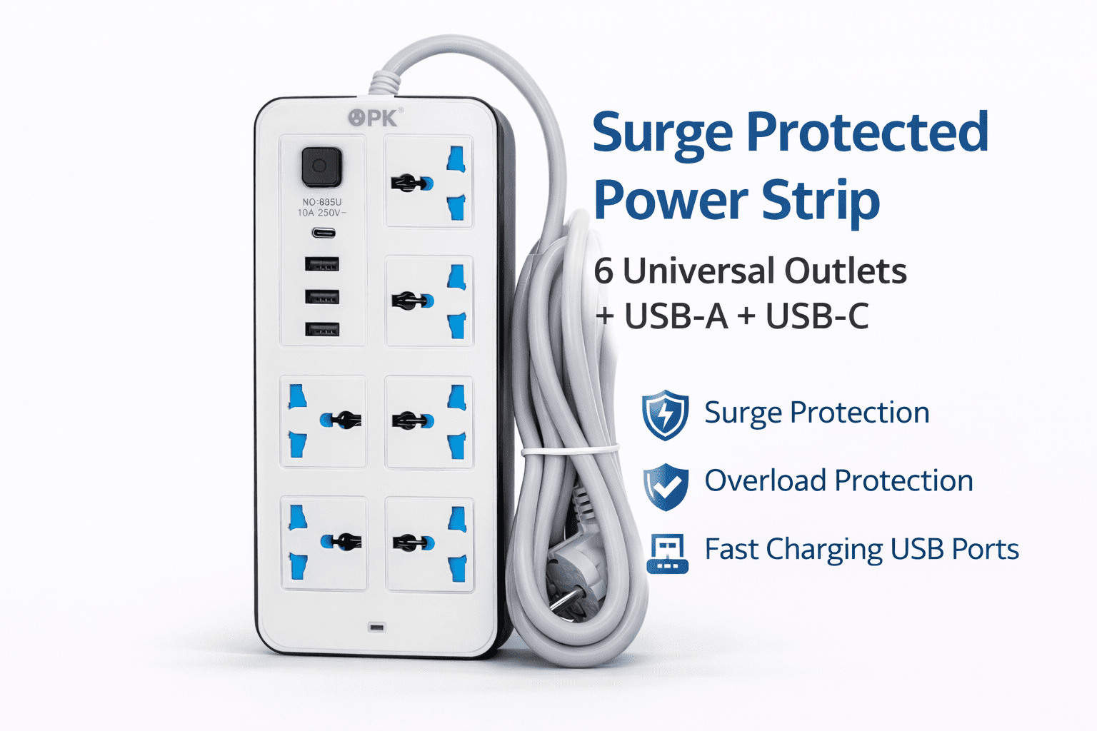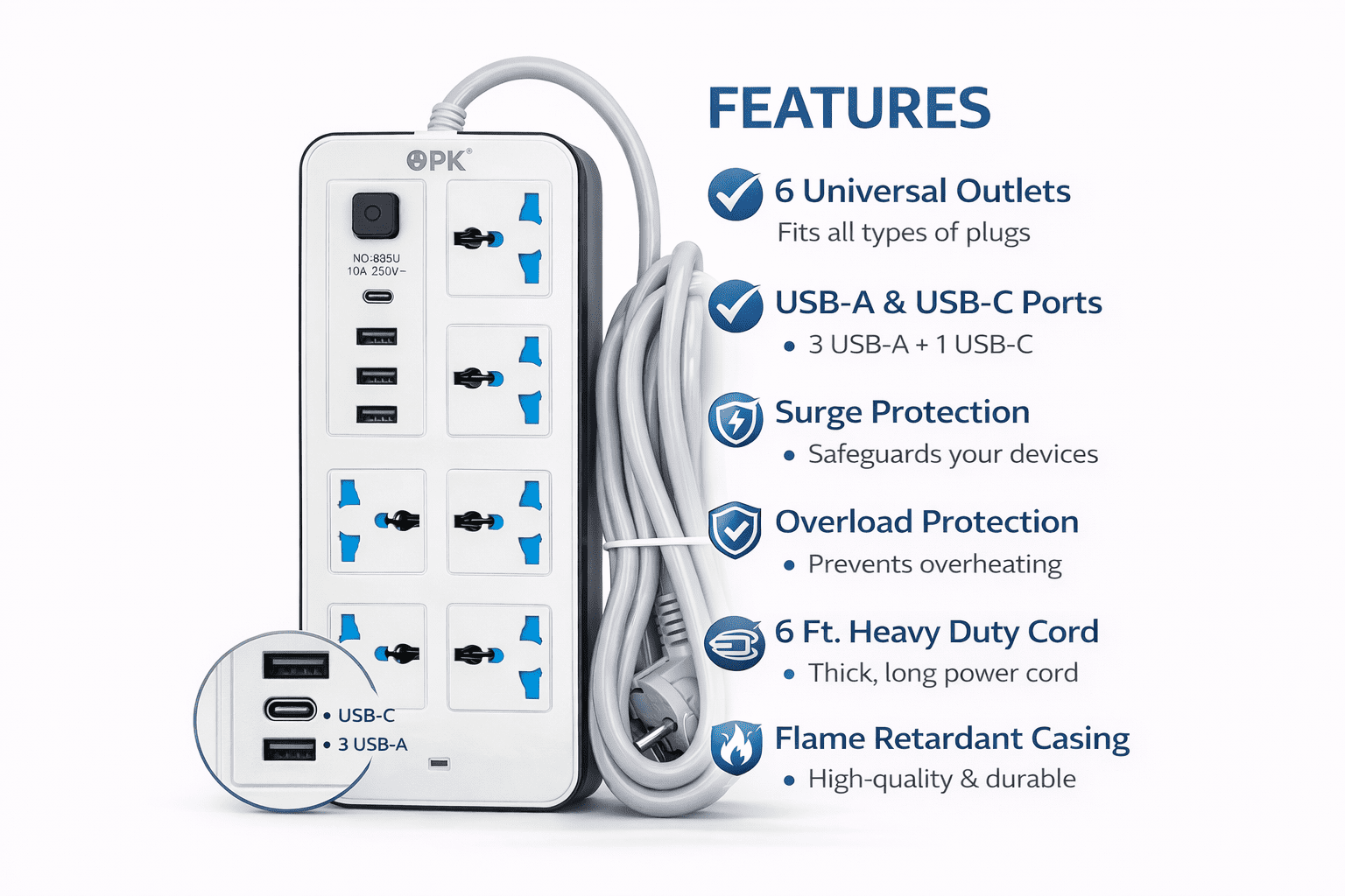 - This power strip offers 6 AC outlets, designed for standard plug connections. These outlets are perfect for connecting household or office appliances like lamps, computers, printers, and other electronic devices.