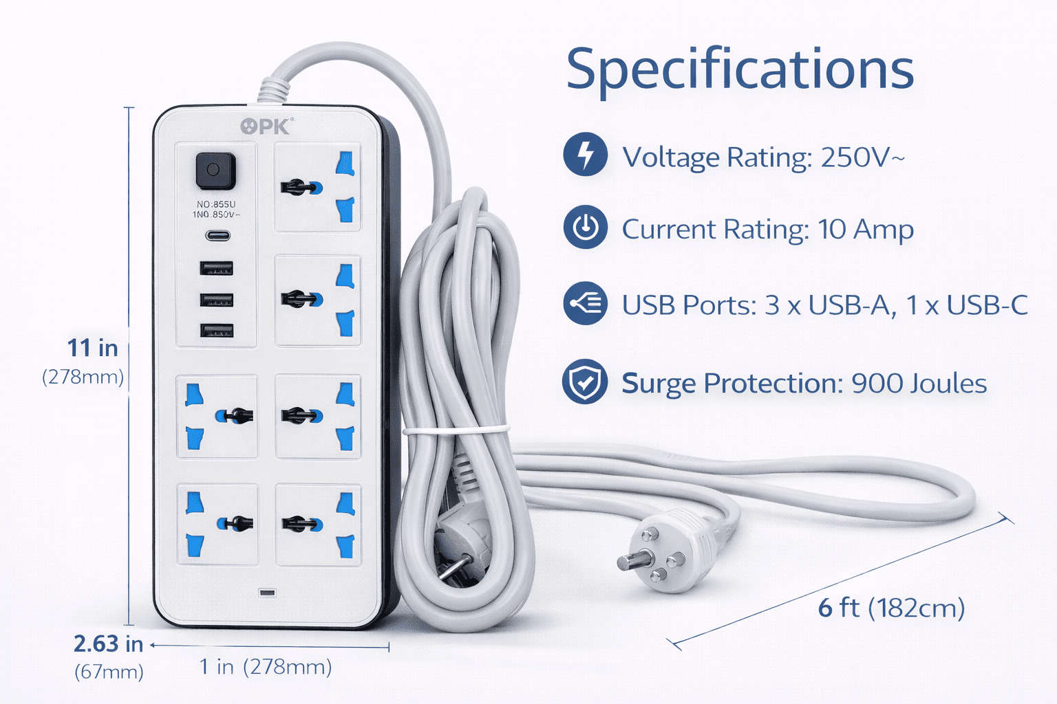 - Built with high-quality plastic material, the power strip is durable, heat-resistant, and safe to use over long periods.