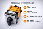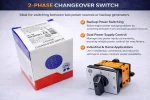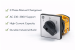 A OPAS 2 Phase Changeover Switch is an electromechanical device designed to manually switch between two power sources (e.g., mains and generator) in a 2-phase system. It’s commonly used in industrial control panels, automation systems, and other applications where safe and reliable source selection is required.