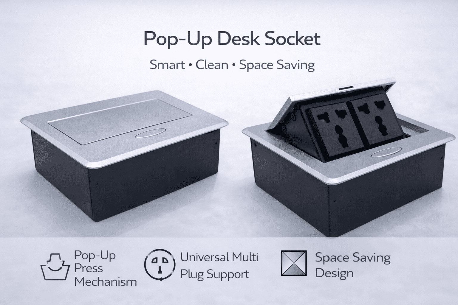 This is a Pop-Up Tabletop Power Outlet Box designed for modern office, conference, and workspace environments. It provides a concealed, space-saving solution for electrical and multimedia connectivity, combining functionality with a sleek, professional finish.