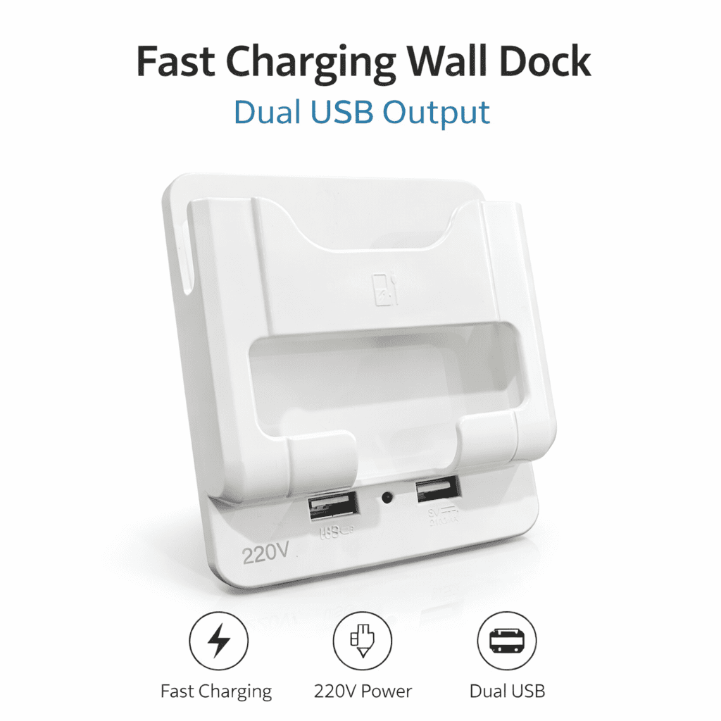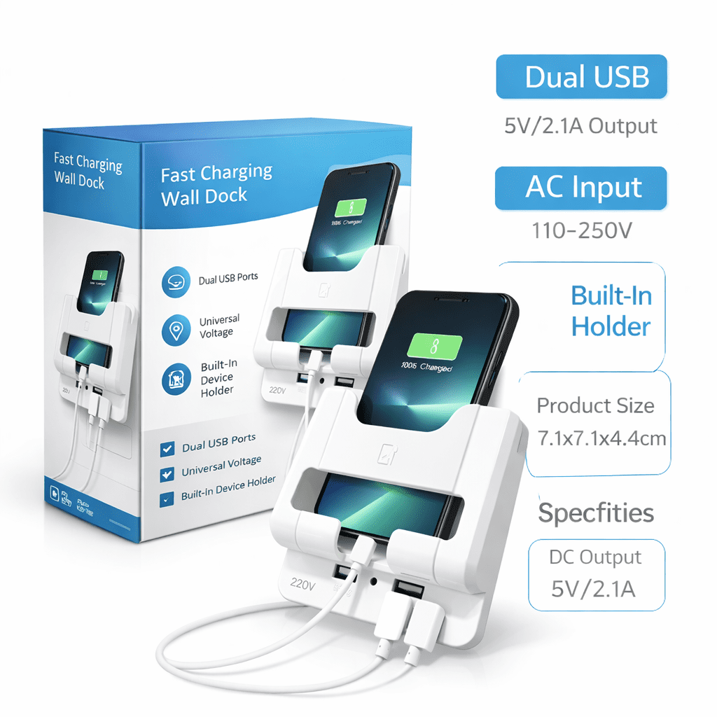 This versatile wall dock is the ultimate space-saving solution for your charging needs. Designed to plug directly into any standard outlet, it eliminates cable clutter by providing a secure, built-in cradle for your devices while they power up. With its sleek white finish and universal compatibility, it’s a functional addition to any home or office.