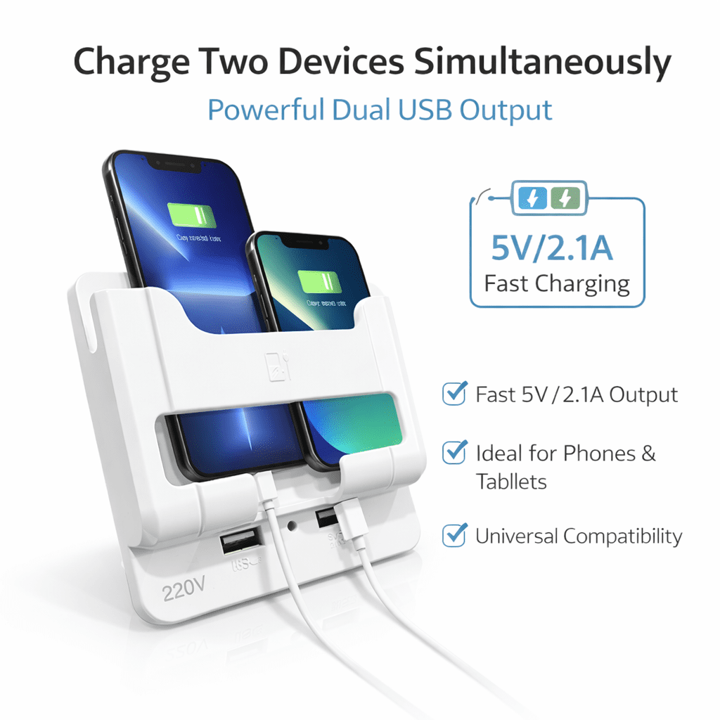 Dual USB Output: Equipped with two high-speed USB ports delivering a total of 5V/2.1A, allowing you to charge a smartphone and a tablet simultaneously.