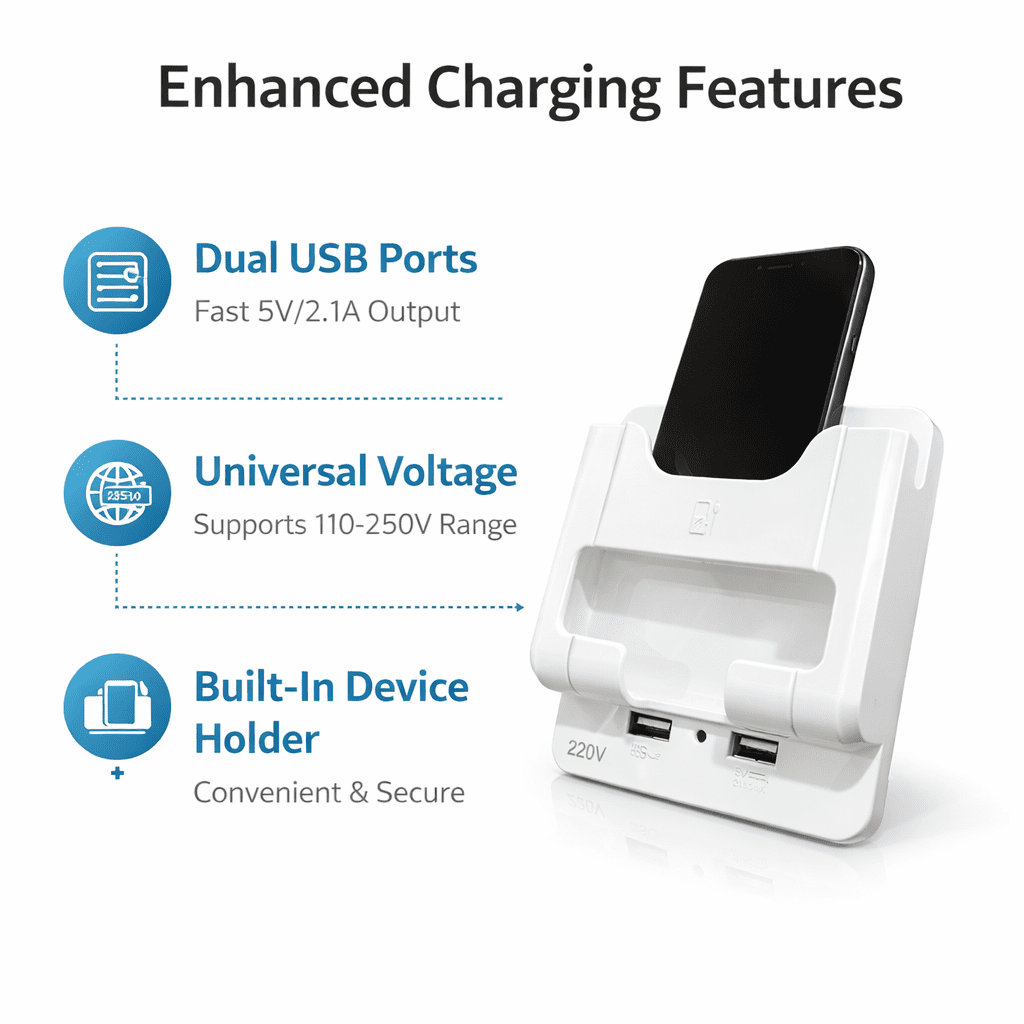 Integrated Device Holder: Features a sturdy, built-in bracket that holds your phones or small tablets securely off the floor or counter.