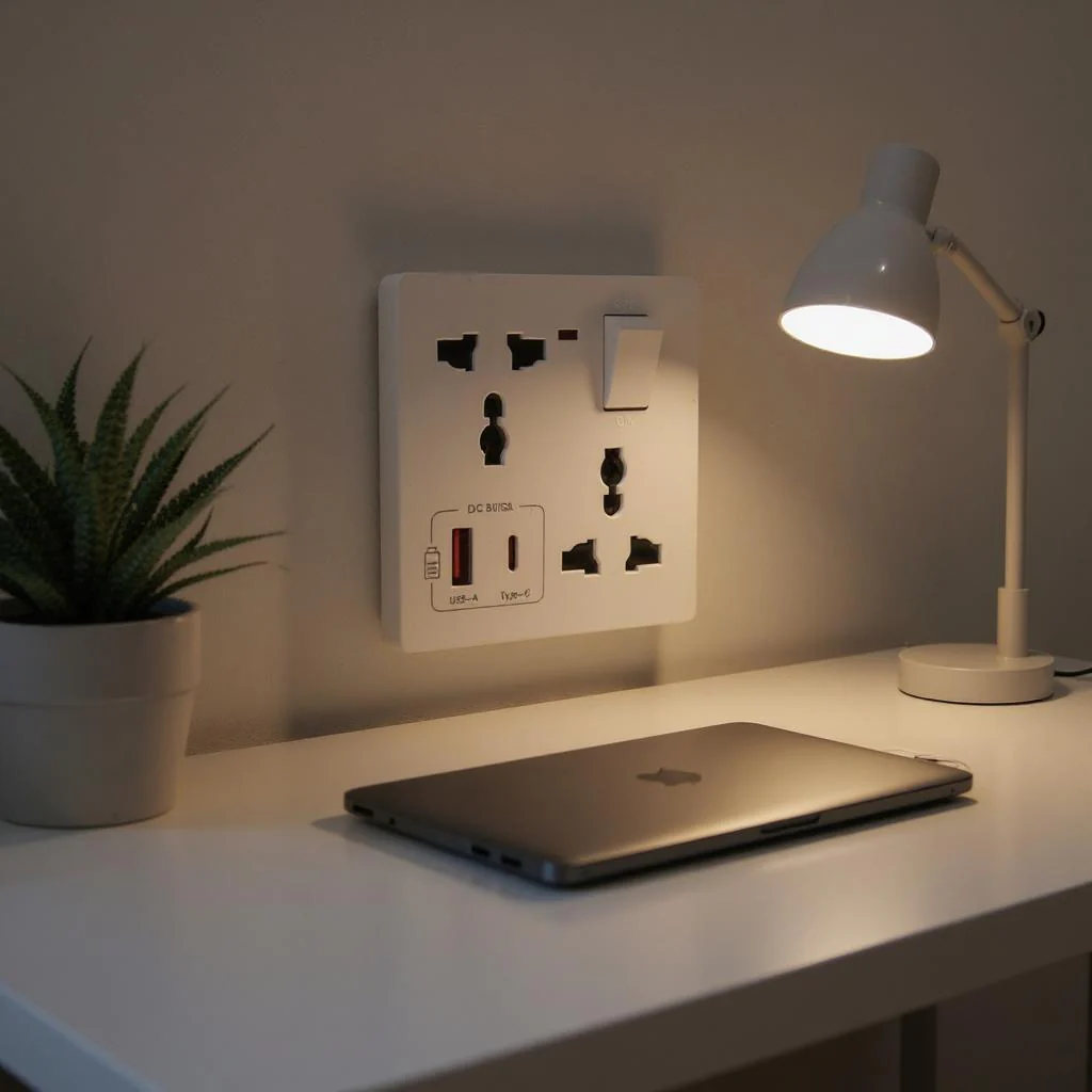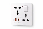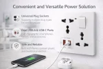 Power Switch Control Manual ON/OFF switch helps control power flow and enhance safety .Modern Clean Design Minimalist white design fits seamlessly into any interior space. Safety Features Built-in child safety shutter, fire-retardant materials, and surge protection.