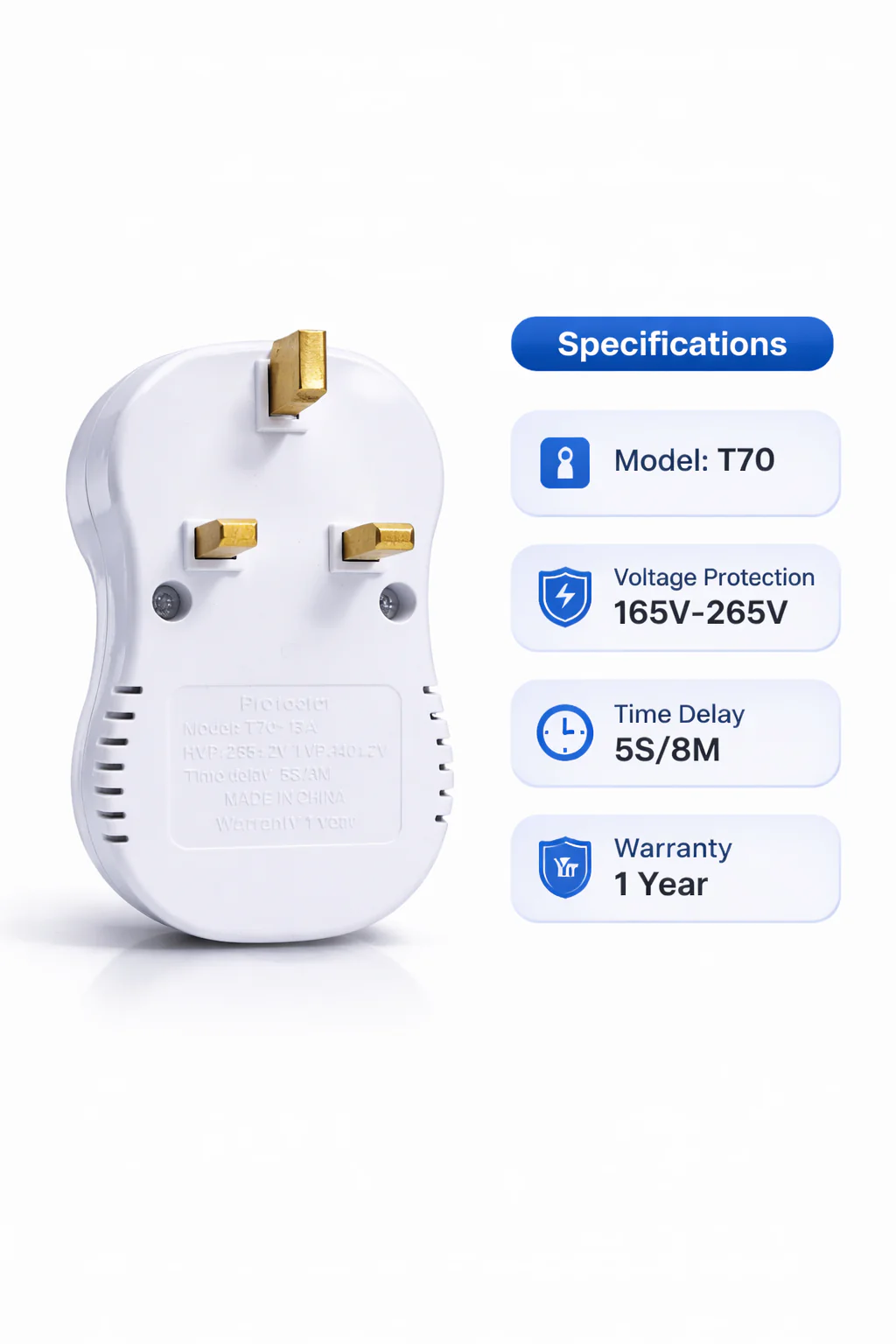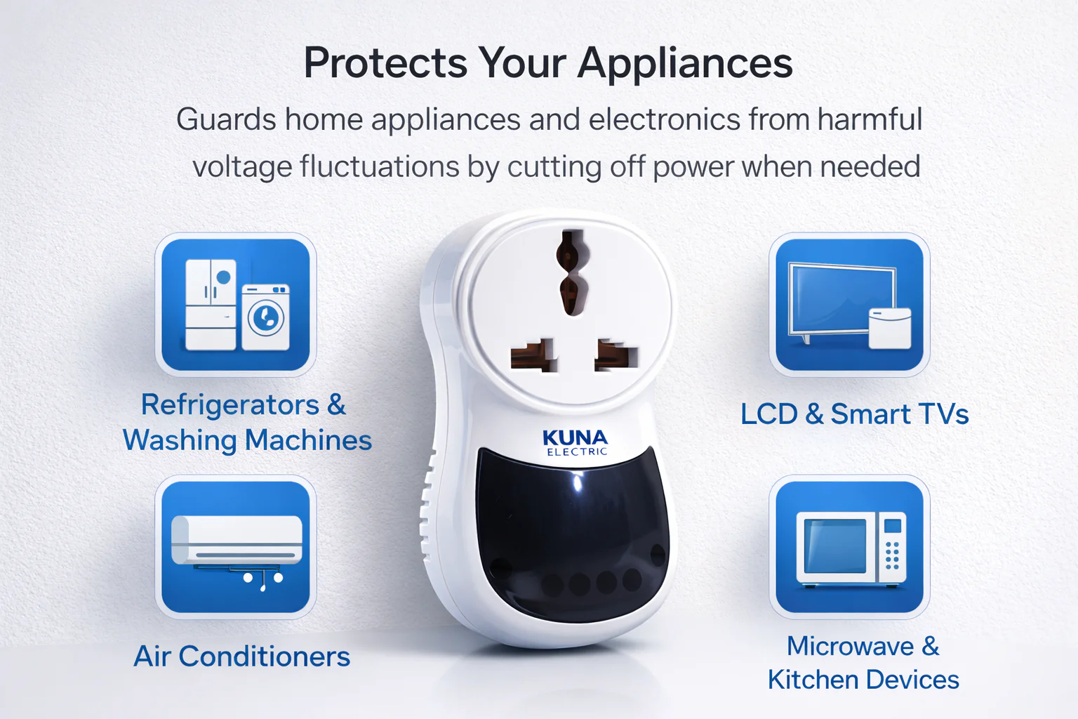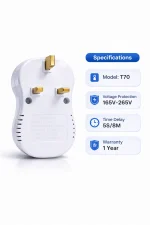 The KUNA Electric T70 Electronic Protector is a compact and intelligent voltage protection device, designed to shield your valuable appliances from power fluctuations, voltage spikes, and electrical surges. This plug-in protector is ideal for safeguarding electronics such as TVs, fridges, and computers in both residential and commercial settings.