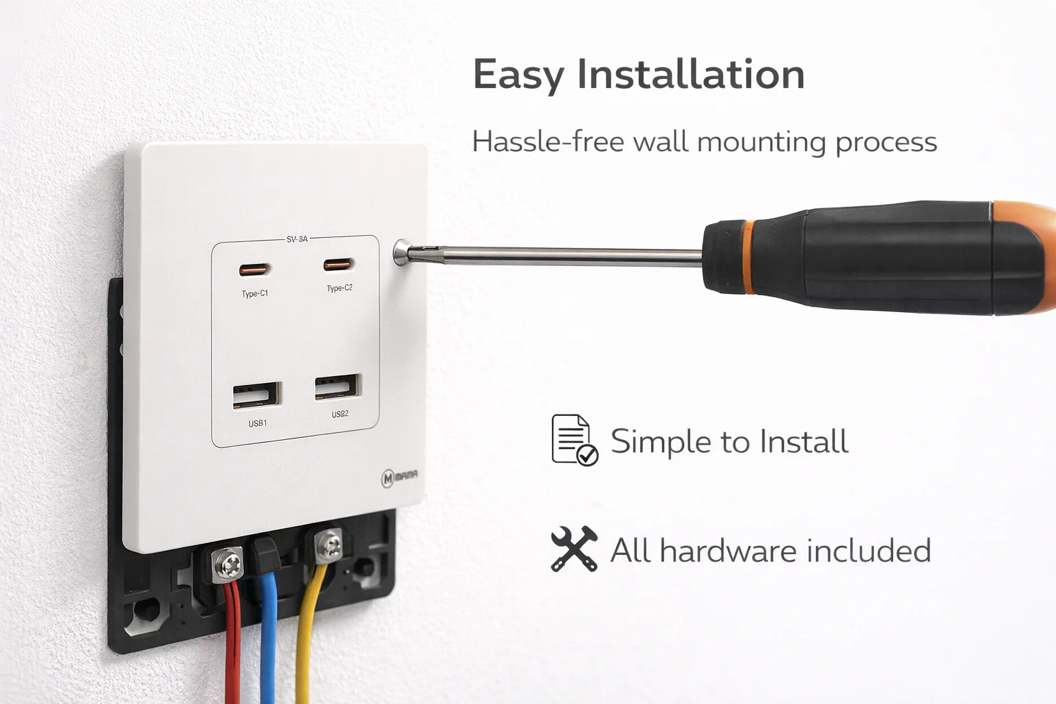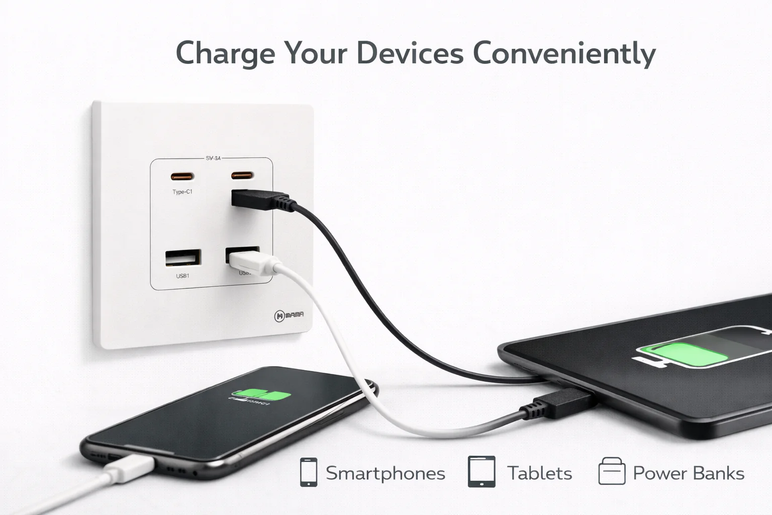 Charge all your devices from one clean, built-in solution. This wall-mounted USB charging socket is designed to streamline your space while powering multiple devices at once. Ideal for homes, offices, hotels, or public areas.