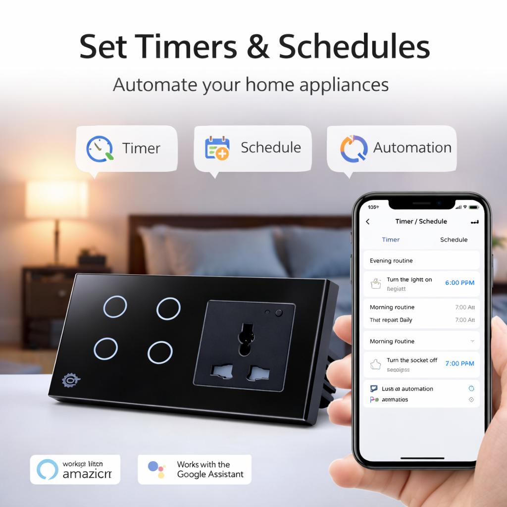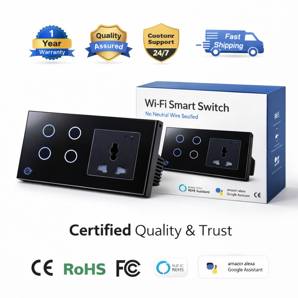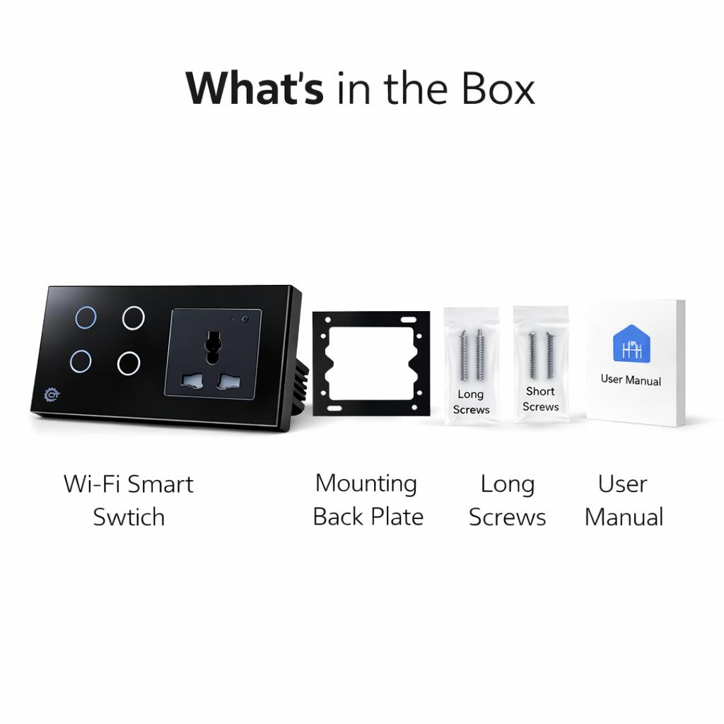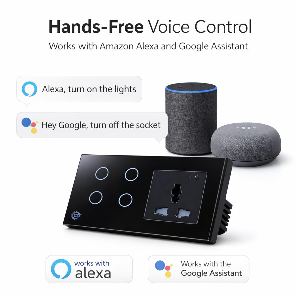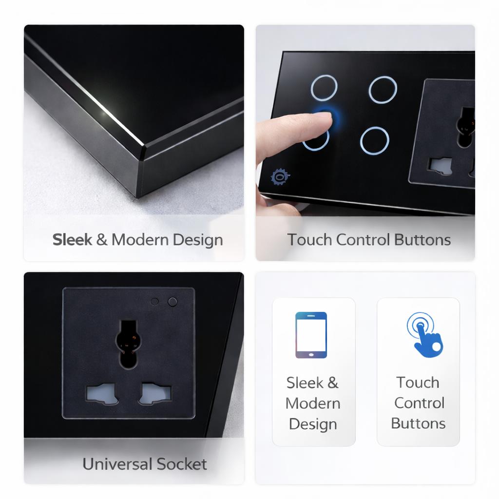 Modernize your home with this premium Wi-Fi Smart Switch and Universal Socket combo. This dual-function device combines a responsive touch-control light switch with a powerful smart socket, allowing you to automate both your lighting and plug-in appliances from a single, sleek wall unit.