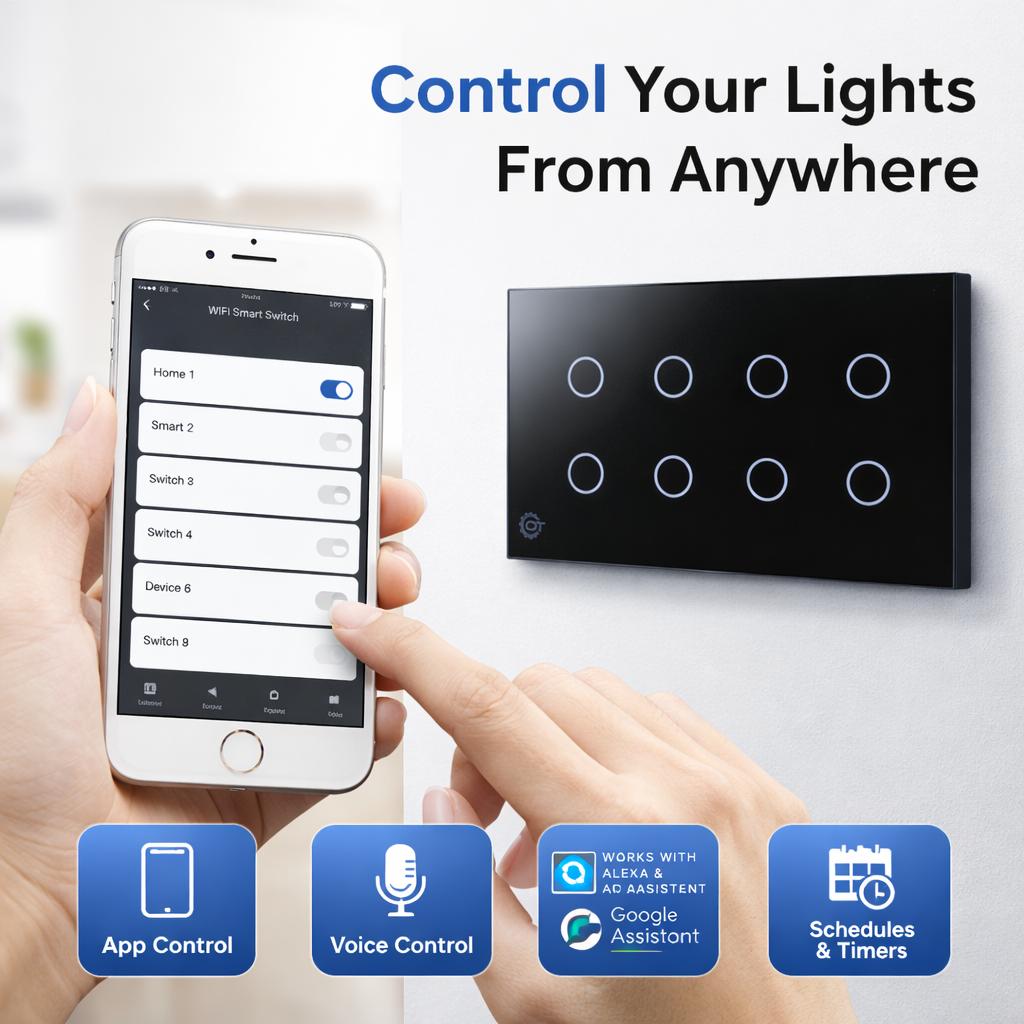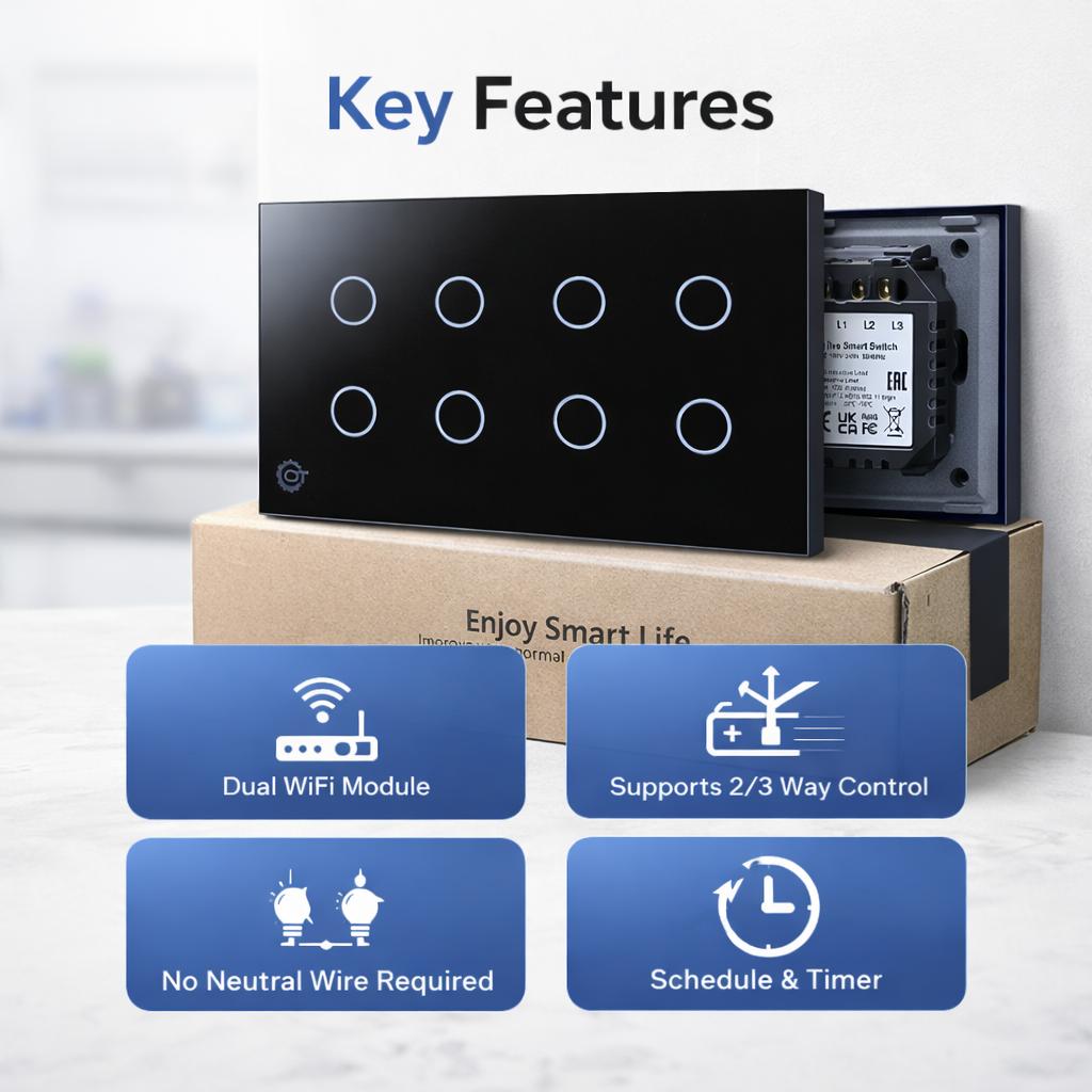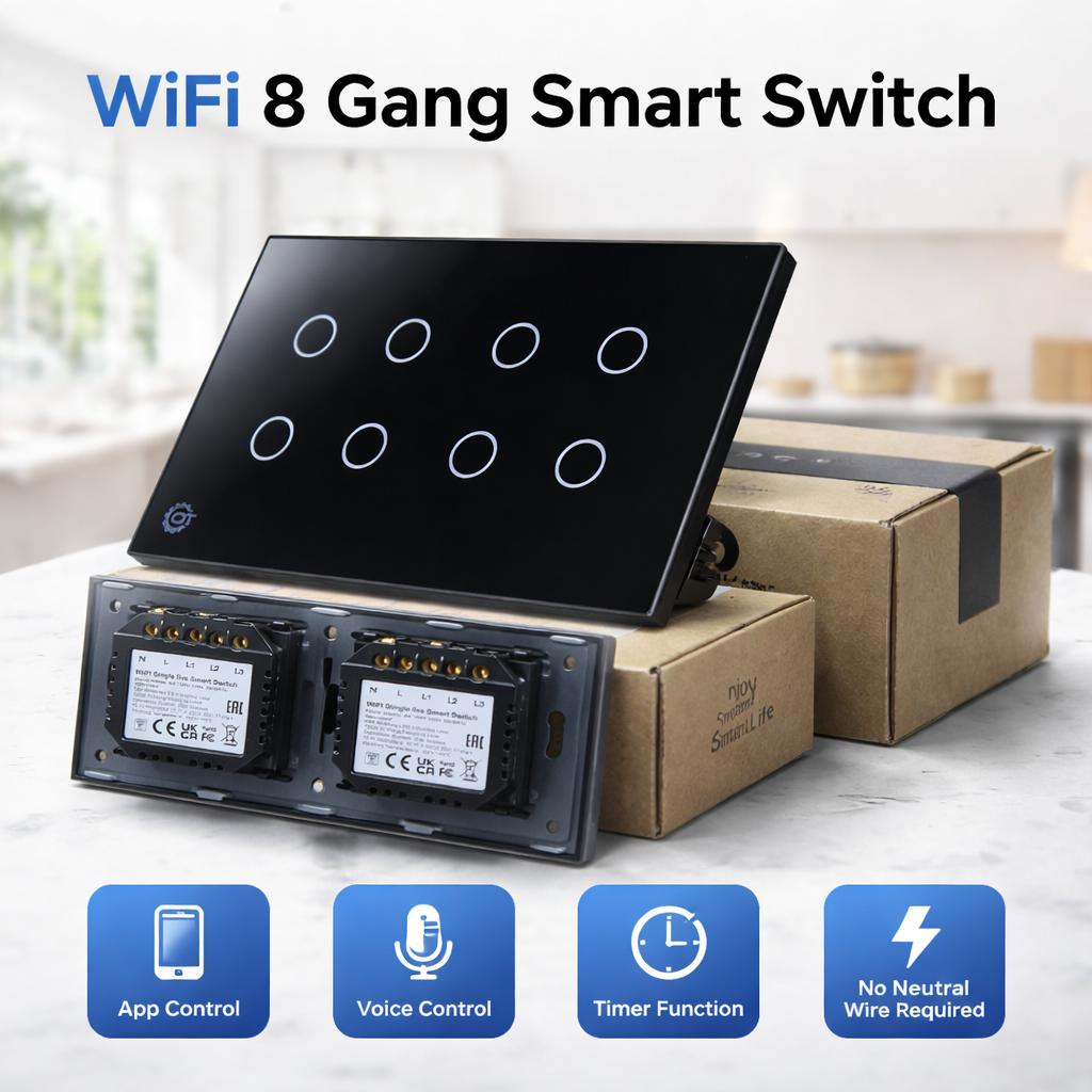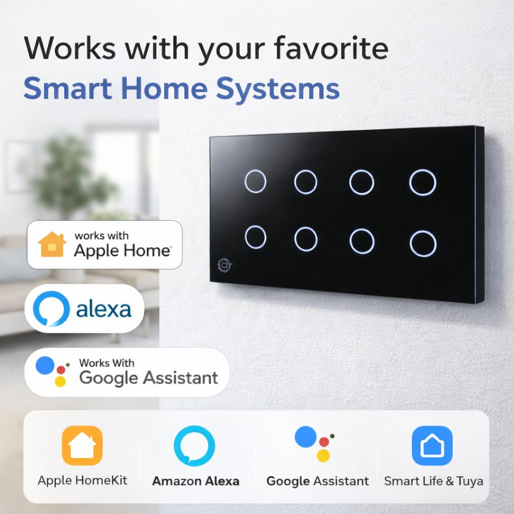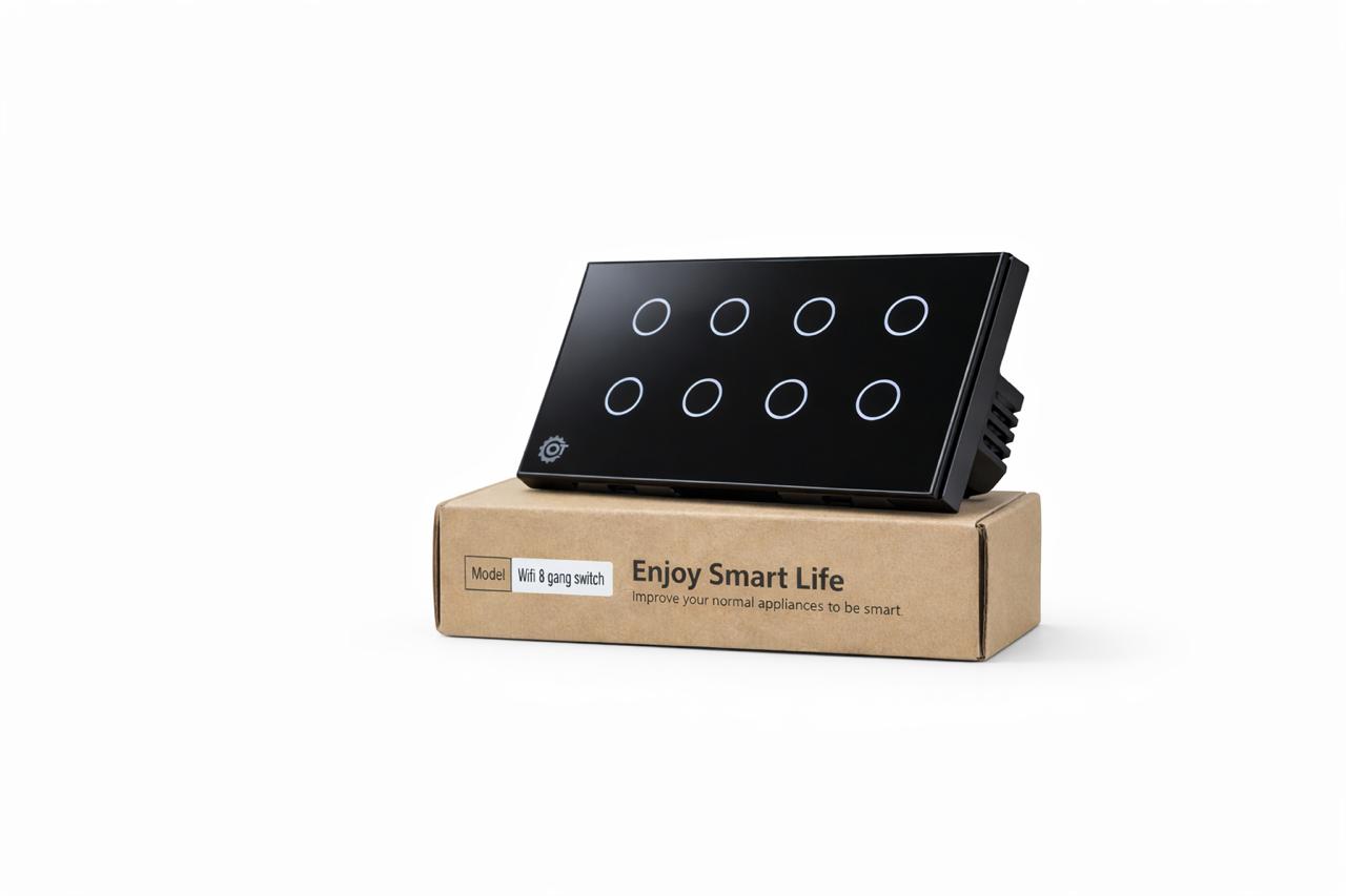 Elevate your home with this high-tech 8-Gang Smart Touch Switch, featuring a sleek, scratch-resistant tempered glass panel available in black or white. This switch replaces traditional mechanical buttons with a minimalist touch interface that integrates seamlessly into any modern living room, kitchen, or office. Engineered for convenience, it supports voice control via Alexa, Google Assistant, and Apple HomeKit, as well as full remote management through the Smart Life or Tuya apps.