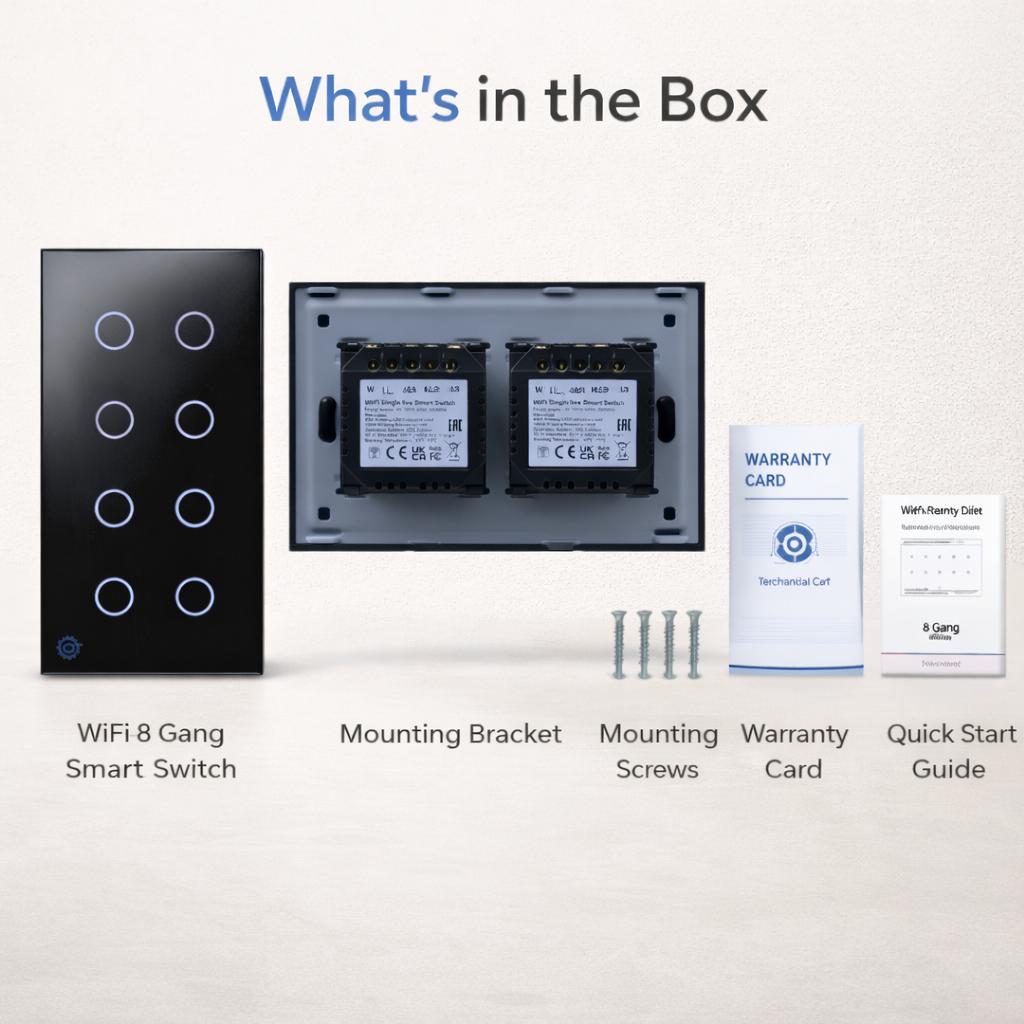 • Box Includes: WiFi 8-Gang Smart Switch, mounting bracket, screws, warranty card, and a quick start guide.